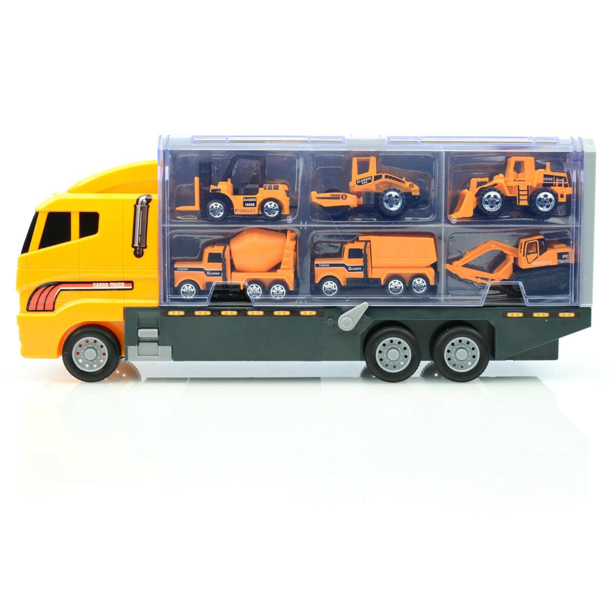 Красиво оформленный набор эвакуатор + машинки, набор состоит из грузовика и 6 строительных машин.