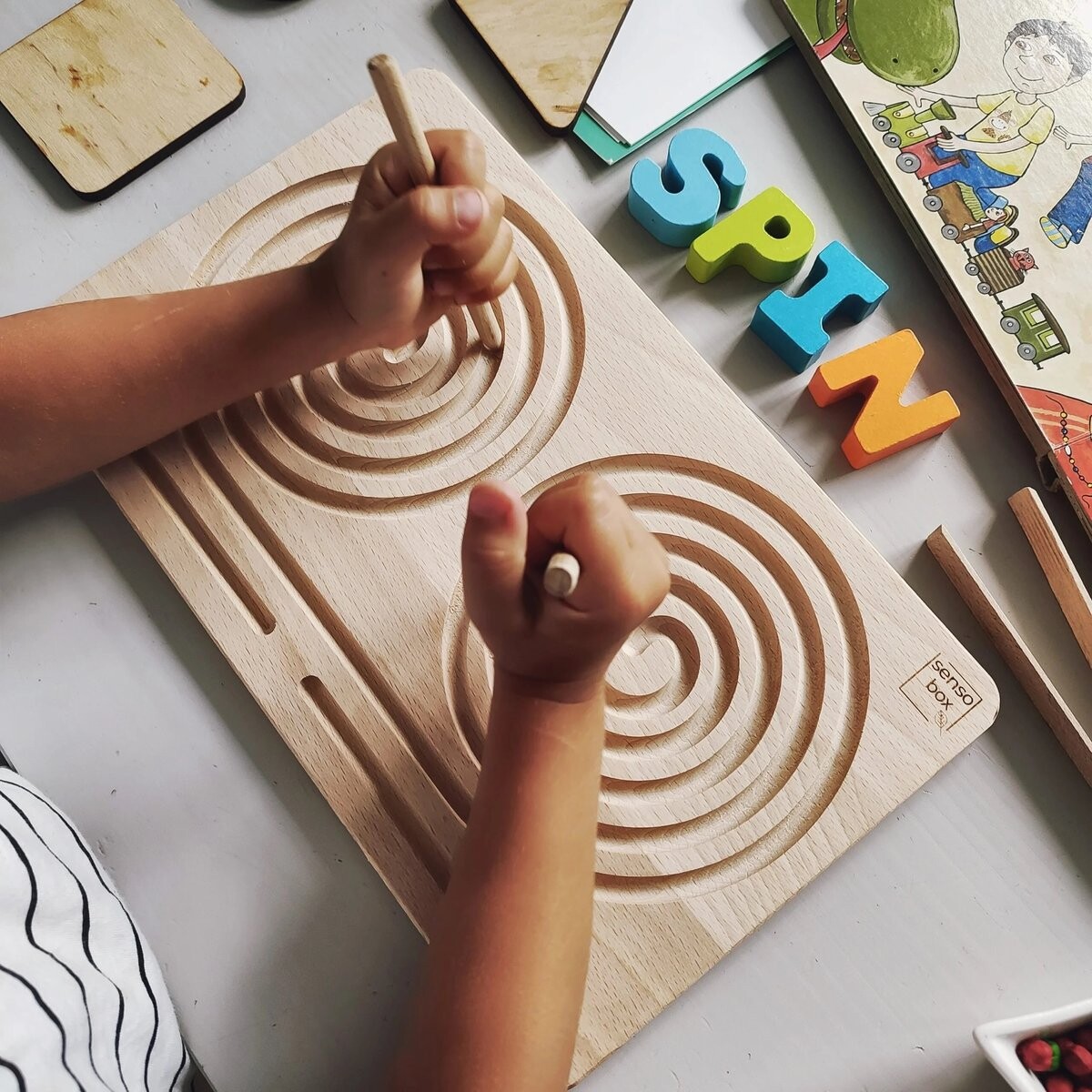 Спиральная графомоторная доска представляет собой деревянную сенсорную панель, имеющую несколько применений. Он полностью изготовлен из массива бука, но на этот раз без использования смолы. В набор входят два деревянных буковых «карандаша» без стилусов. Благодаря им можно выполнять движения обеими руками одновременно.