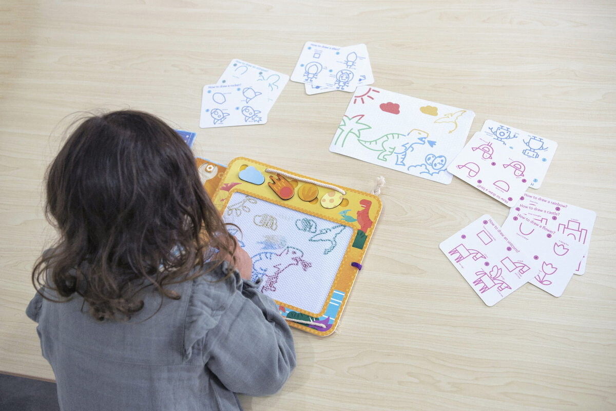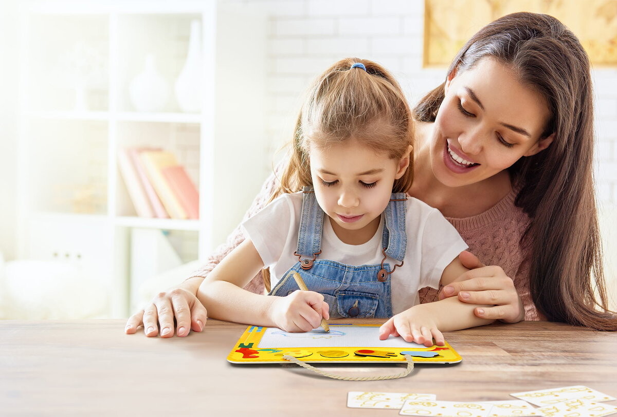 Состав: доска для рисования, 20 карточек с инструкциями, 4 шаблона, 4 магнитных штампа, деревянное перо