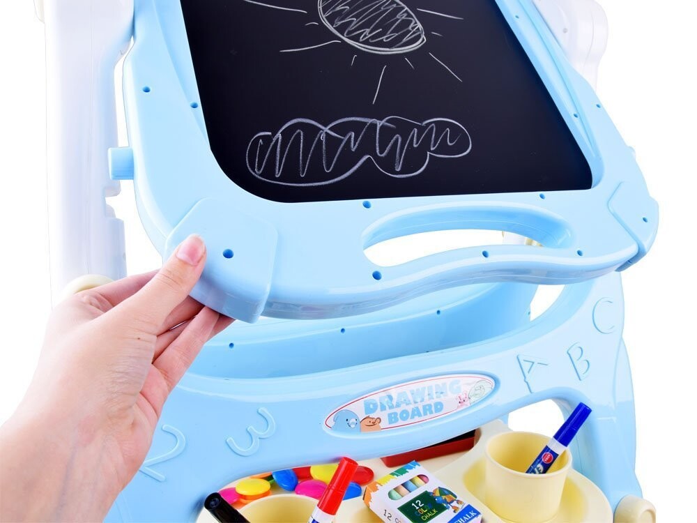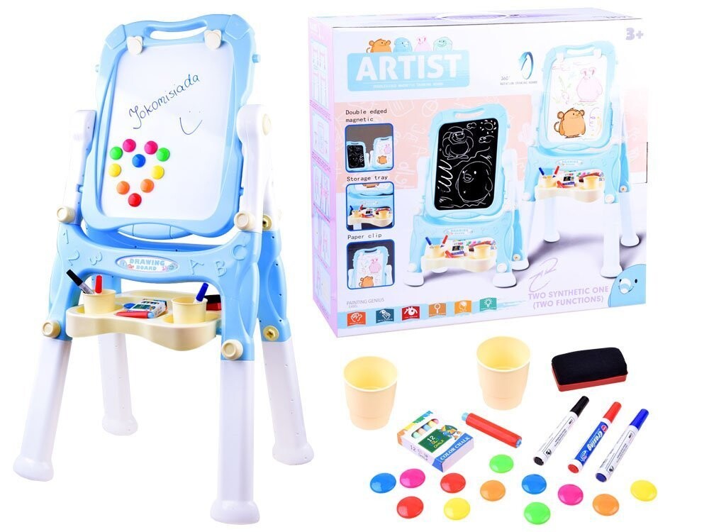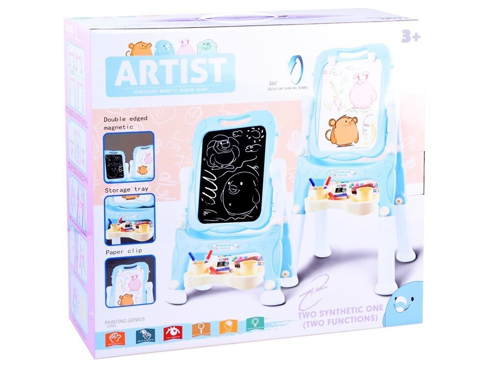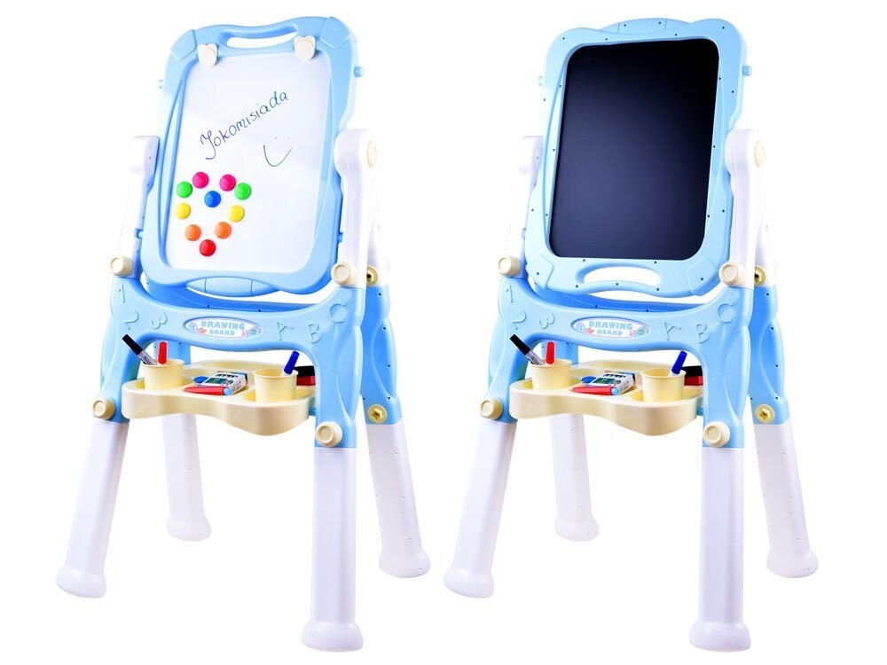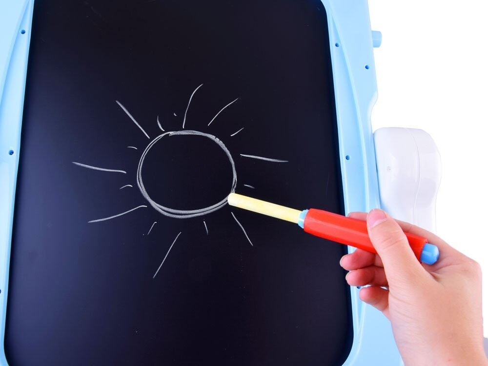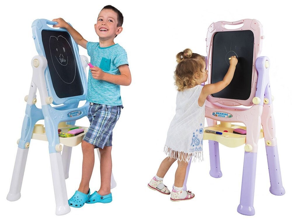 Доска имеет вращающуюся поверхность для рисования и рисования. Одна черная сторона предназначена для письма мелом, а другая магнитная сторона идеально подходит для крепления магнитов, письма сухостираемым маркером или крепления листов бумаги для раскрашивания картин или рисунков. На доске есть полочка для мелков, красок и принадлежностей для рисования. рисунок .