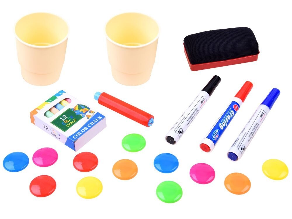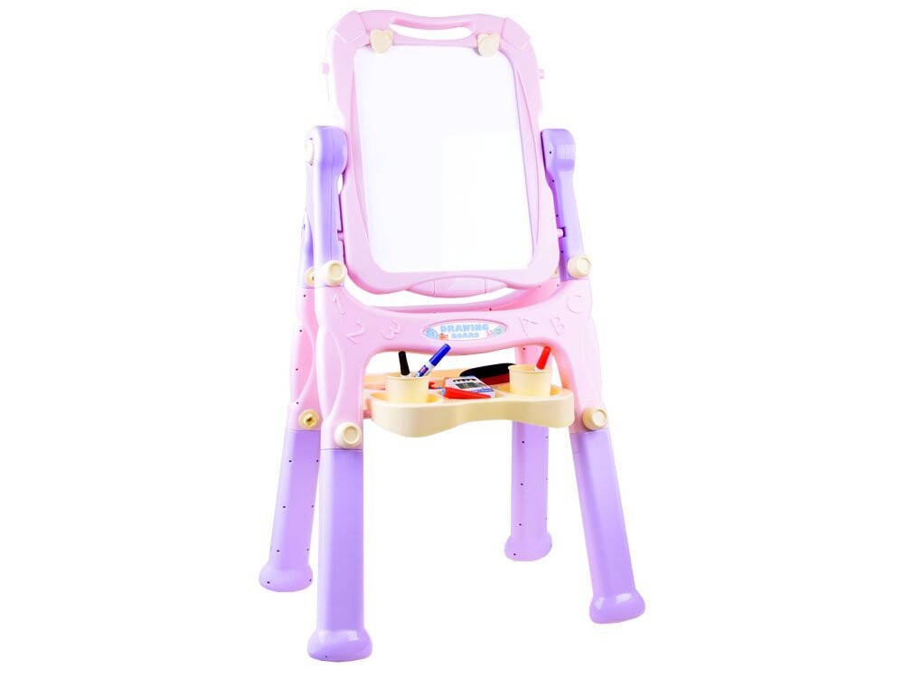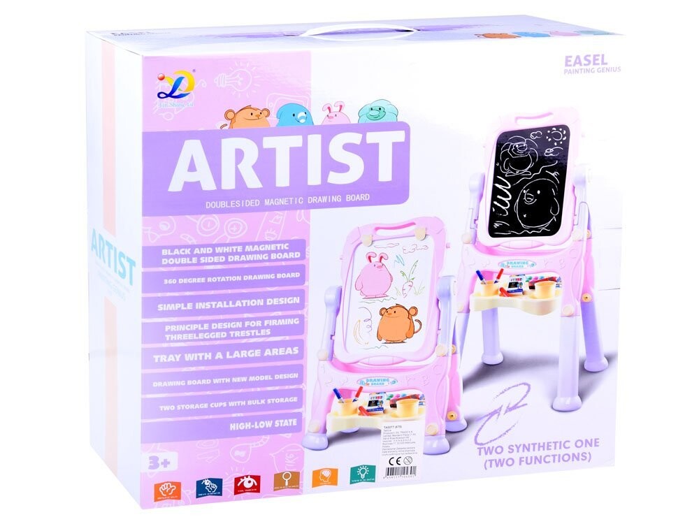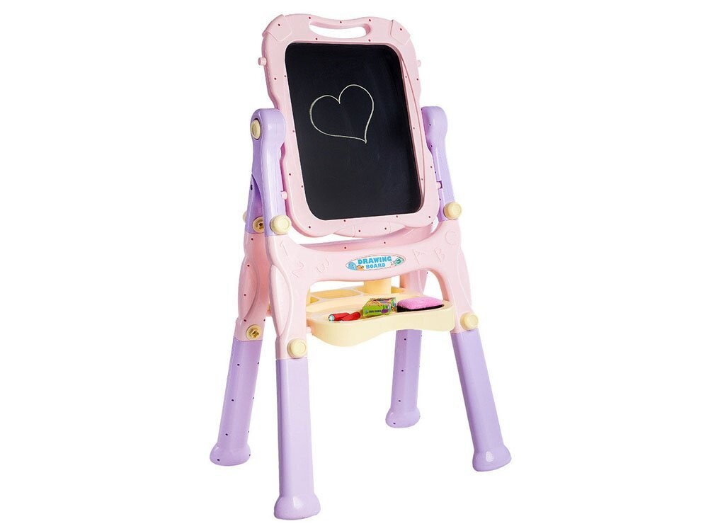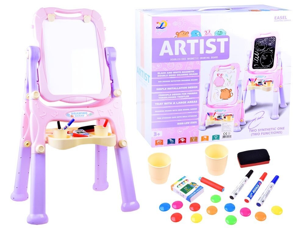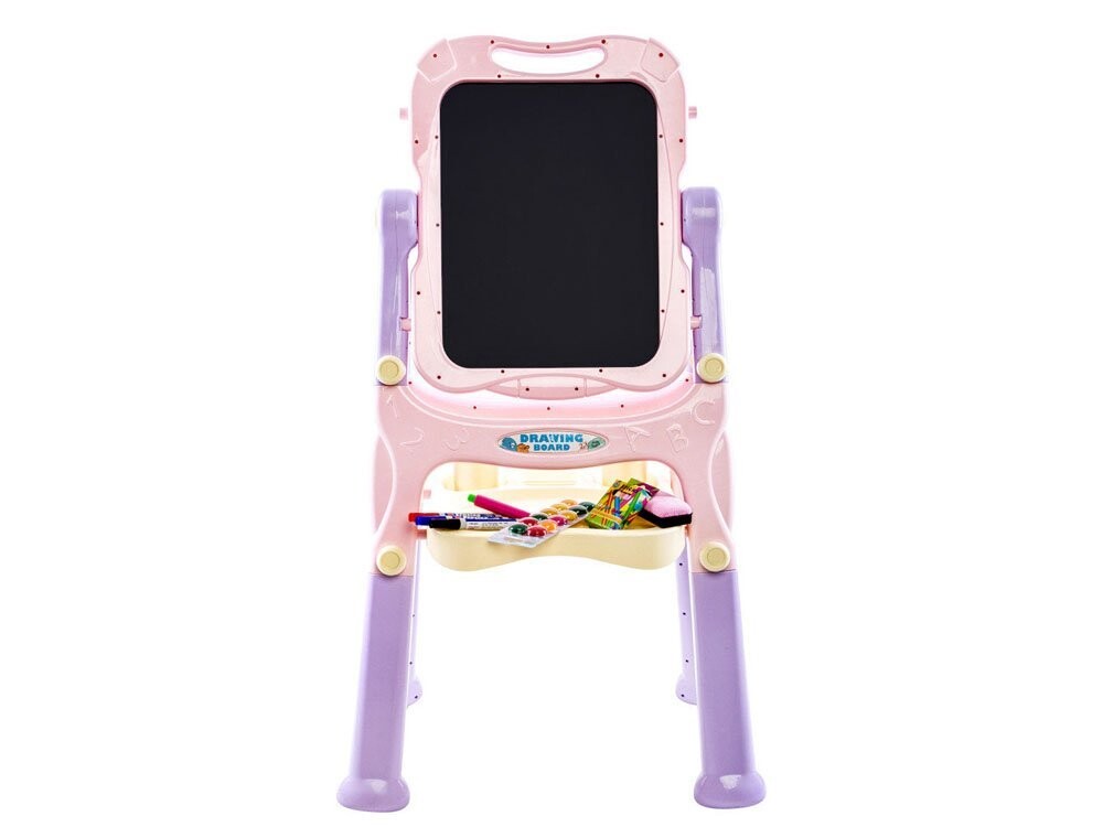 Доска имеет вращающуюся поверхность для рисования и рисования. Одна черная сторона предназначена для письма мелом, а другая магнитная сторона идеально подходит для крепления магнитов, письма сухостираемым маркером или крепления листов бумаги для раскрашивания картин или рисунков. На доске есть полочка для мелков, красок и принадлежностей для рисования. рисунок .