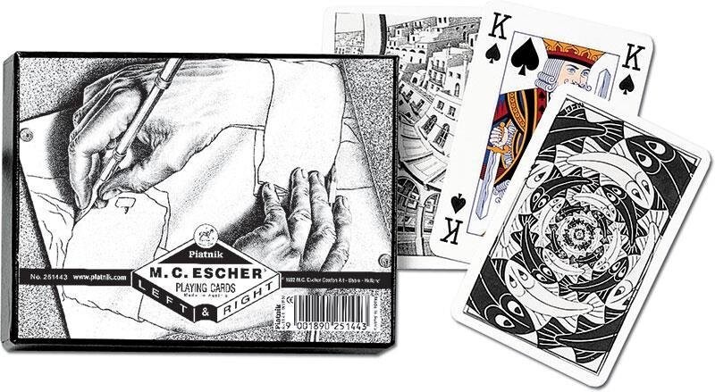 В комплект входят 2 колоды в элегантной позолоченной коробочке с характерной пятниковской подушкой. На реверсах (футболок) и на коробке – нетрадиционные картины голландского художника М. С. Эшер.