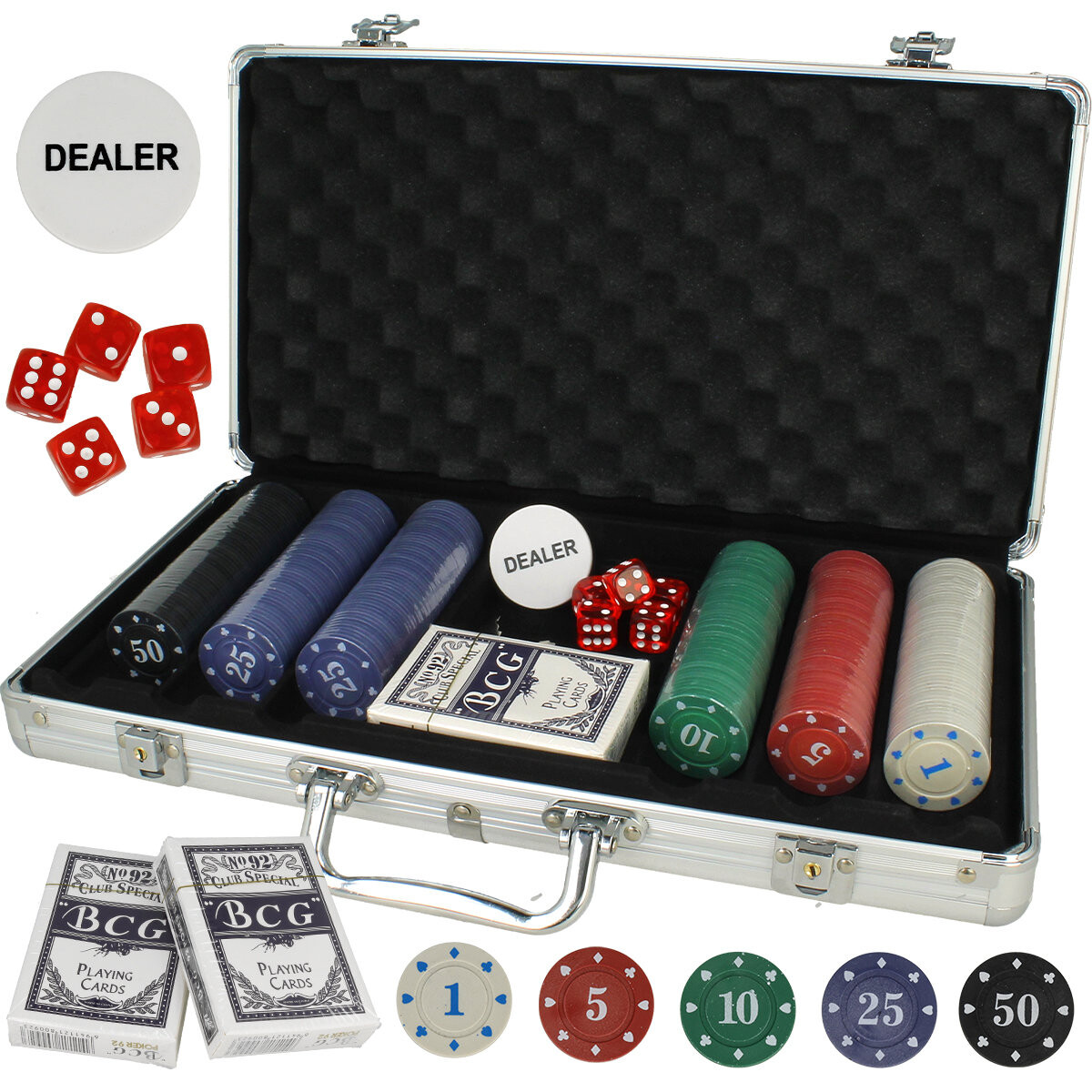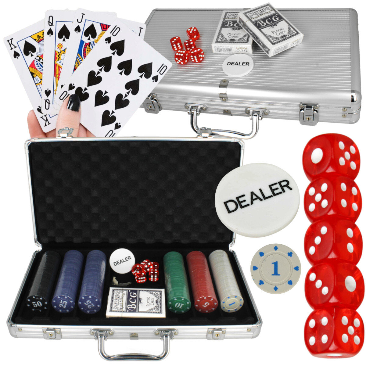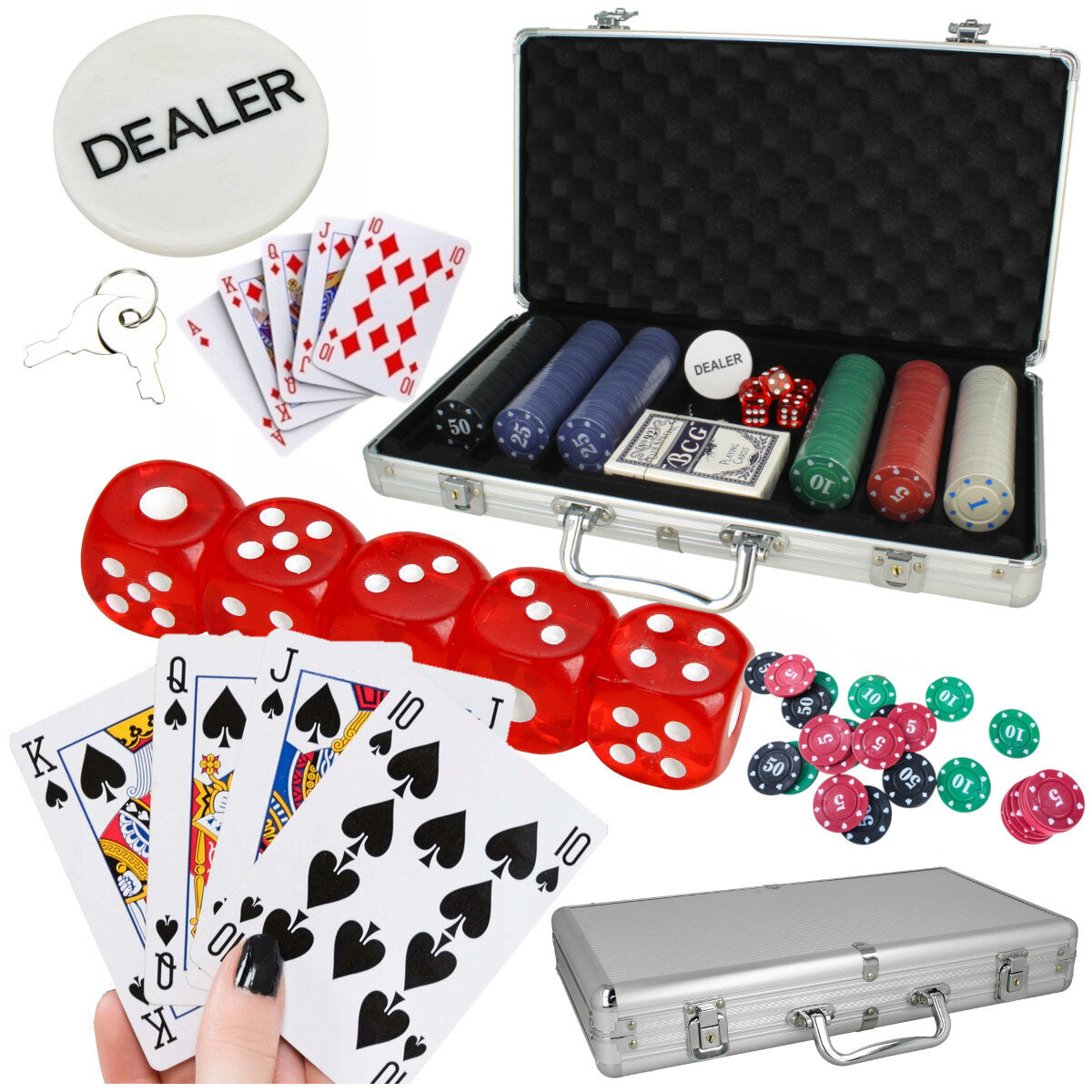 Профессиональный, добротно сделанный набор для игры в покер или кости. В комплекте две колоды карт, набор игральных костей и 300 игровых жетонов, упакованные в элегантный чемодан. Он содержит все элементы, необходимые для игры в покер, кости или блэкджек: две колоды карт, набор игральных костей. жетон дилера - ДИЛЕР. ИГРАЙТЕ И ИЗУЧАЙТЕ РАЗНЫЕ ВЕРСИИ ПОкера