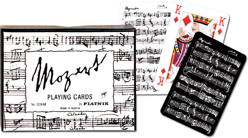 В комплект входят 2 колоды в элегантной коробке с характерной подушечкой «Пятник», и весь набор в очень оригинальной, черно-белой оправе из нот Моцарта. Колоды состоят из 55 пластиковых карт размером 58 х 89 мм и весом 310. Идеально подходит для бриджа, покера, рамми и других игр.