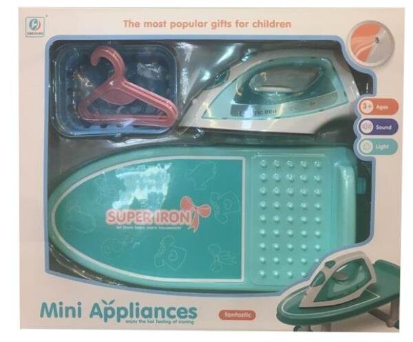 Гладильный набор содержит необходимые элементы, которые позволят детям воссоздать повседневные дела. В комплект входит раскладная гладильная доска, утюг, корзина для белья и 2 вешалки. Детям понравятся световые эффекты и функция пара в игрушечном утюге, что сделает игру более реалистичной. Гладильный набор изготовлен из высококачественного материала синего цвета. Взяв на себя роль взрослых, малыши познают мир и осваивают новые обязанности. Для работы утюга требуются 3 батарейки типа АА (не входят в комплект). Не нагревается и безопасен для детей. Размеры упаковки: 42х10,5х36 см. Размеры гладильной доски: 38х17х14 см. Возраст: 3+.