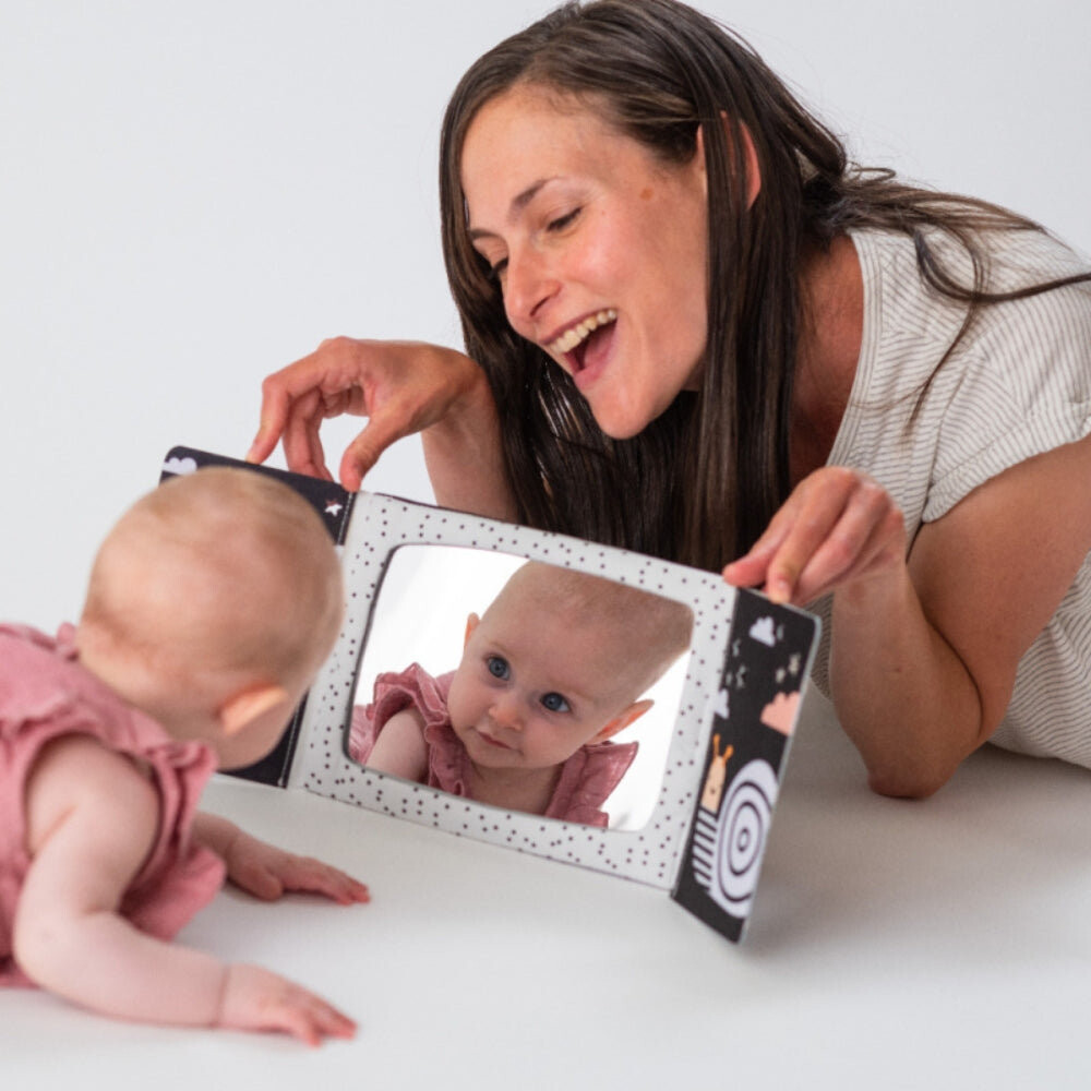 Детская книга с большим безопасным зеркалом и высококонтрастными иллюстрациями, которые стимулируют чувства и эмоциональный интеллект вашего ребенка.