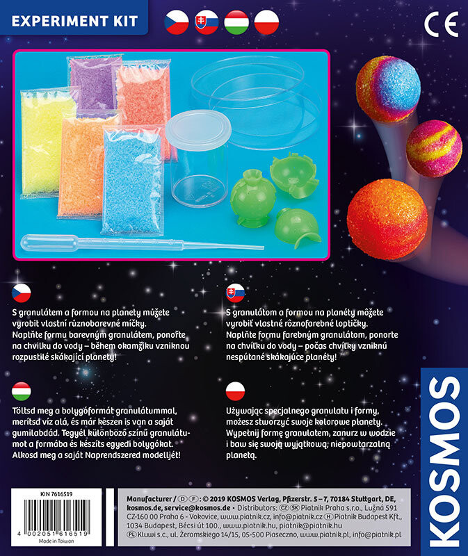 Создавайте уникальные прыгающие планеты. Используя специальные гранулы и формы, вы сможете создать свои красочные планеты. Наполните форму гранулами, погрузите ее в воду и играйте со своей неповторимой, неповторимой планетой.