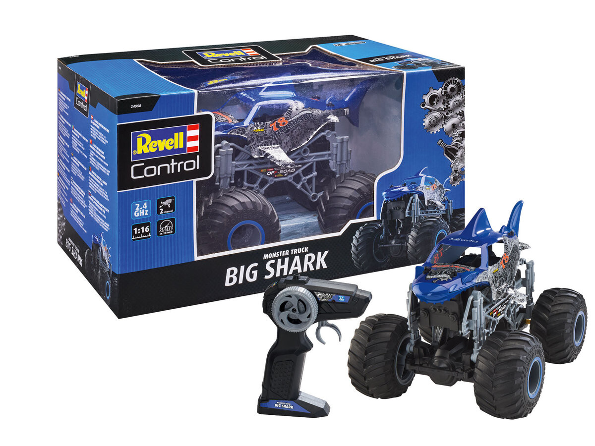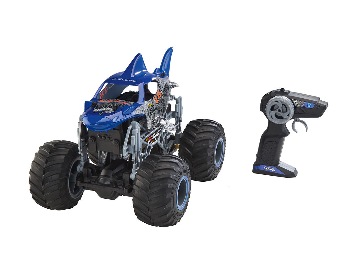 Акула СИГНАЛИЗАЦИЯ... уже в пути?! С Revell Control «Большая Акула» вы можете сделать опасной любую местность! Большая акула привлекает внимание, где бы вы ее ни увидели. Но его оснащение еще более впечатляет: огромные резиновые шины-монстры, пульт дистанционного управления с частотой 2,4 ГГц для многопользовательской игры, сменный литий-ионный аккумулятор напряжением 7,4 В и зарядное устройство USB делают Big Shark неотразимым. Причем пульт можно настроить как для правшей, так и для левшей. Требуются 2 батарейки АА 1,5 В (не входят в комплект).