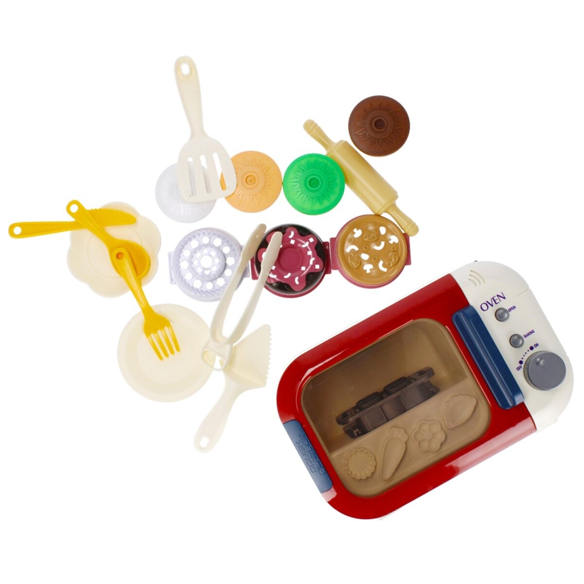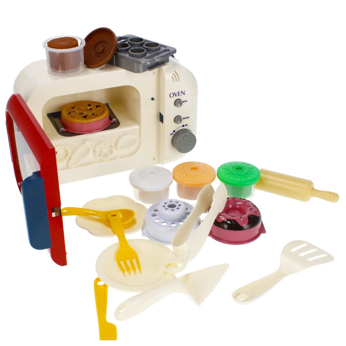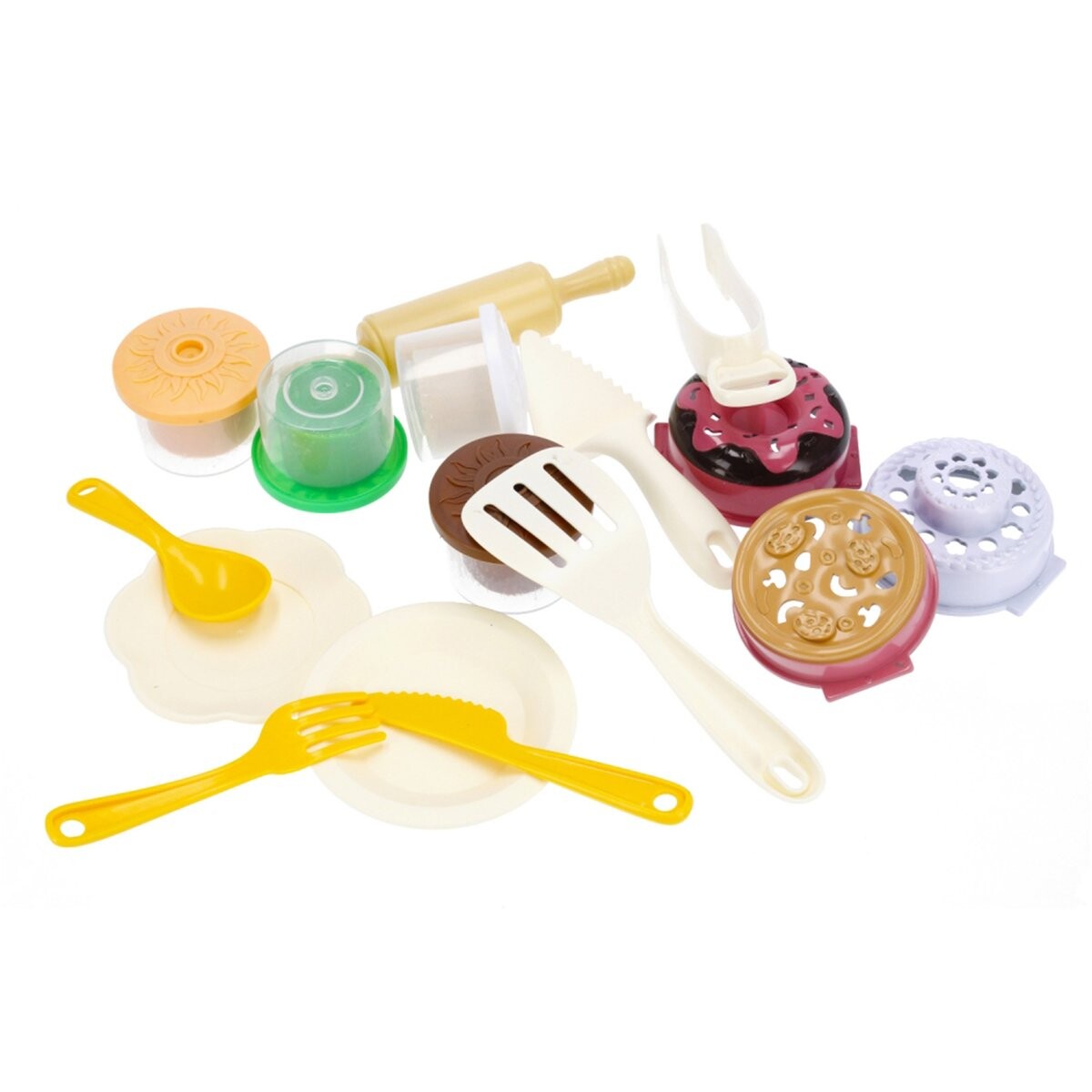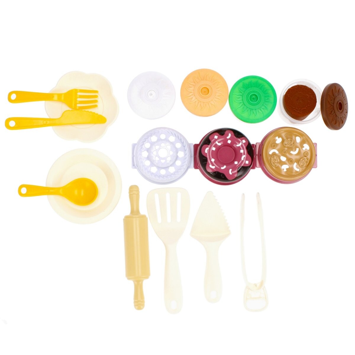 В комплект входят различные аксессуары, такие как скалка, щипцы, тарелки и формочки, которые позволяют детям готовить «вкусные блюда» и экспериментировать с формами.