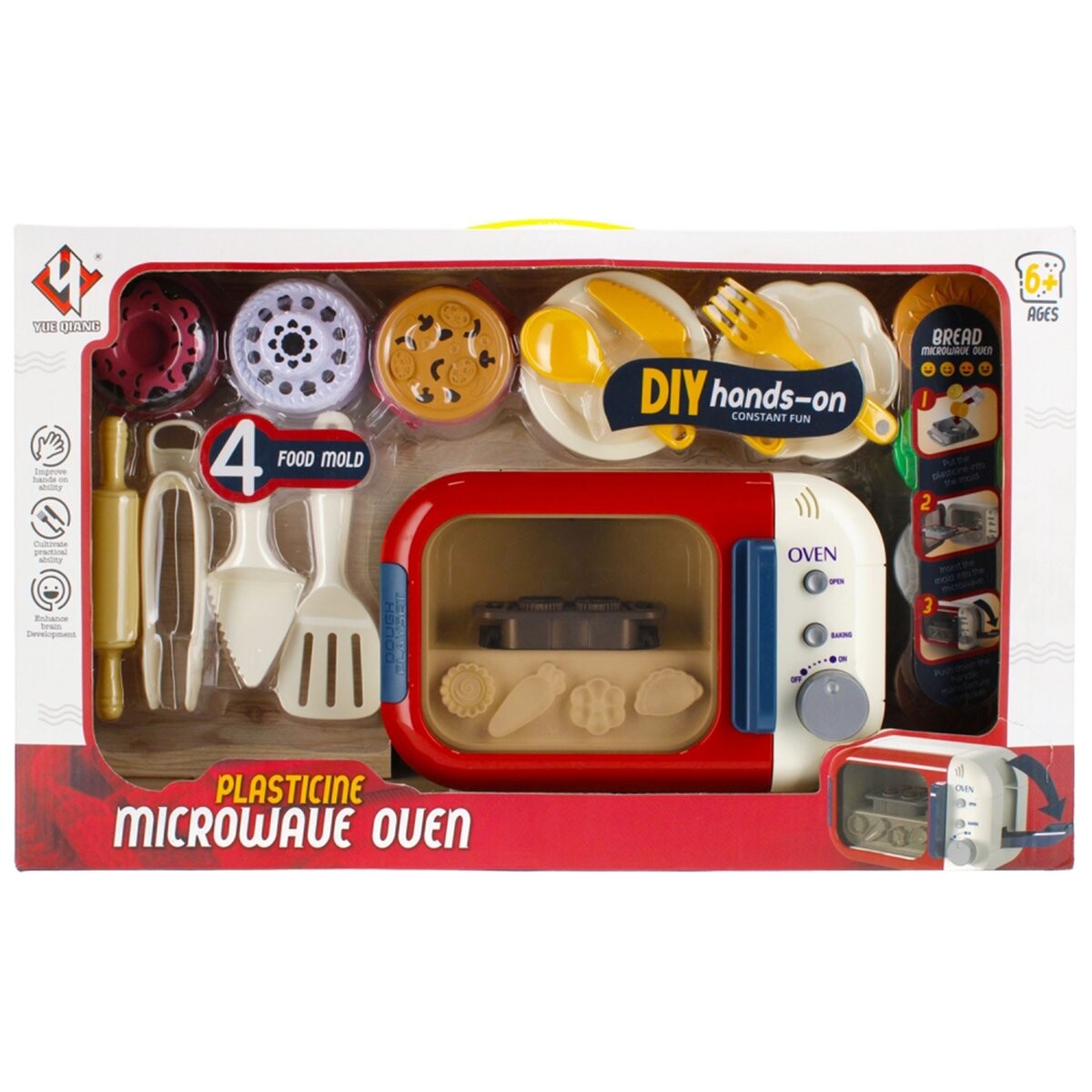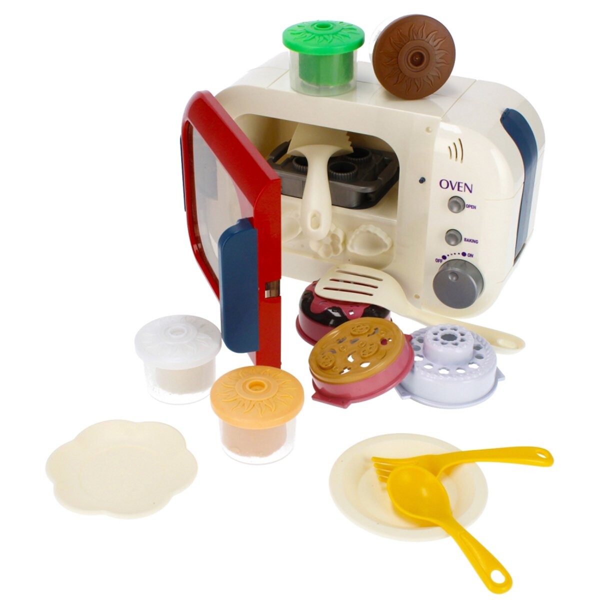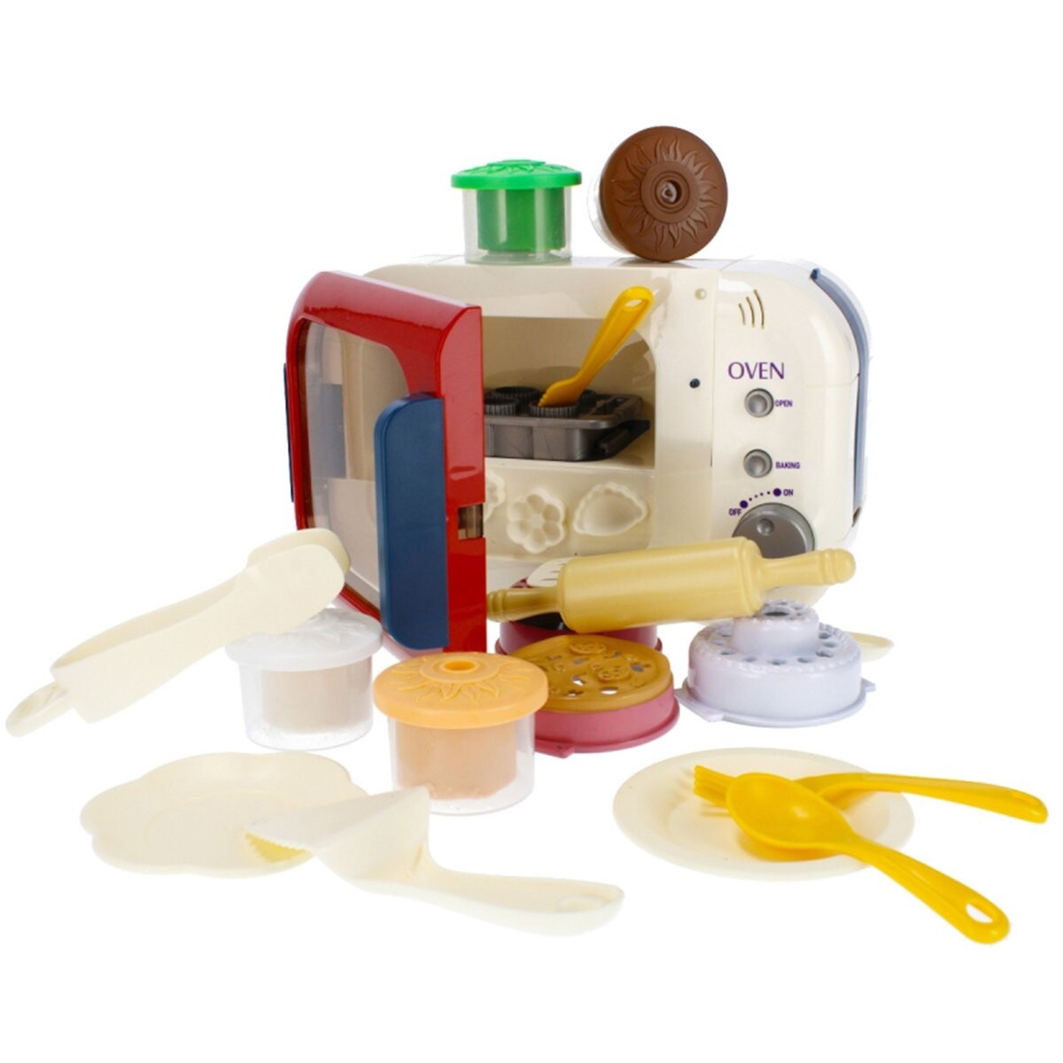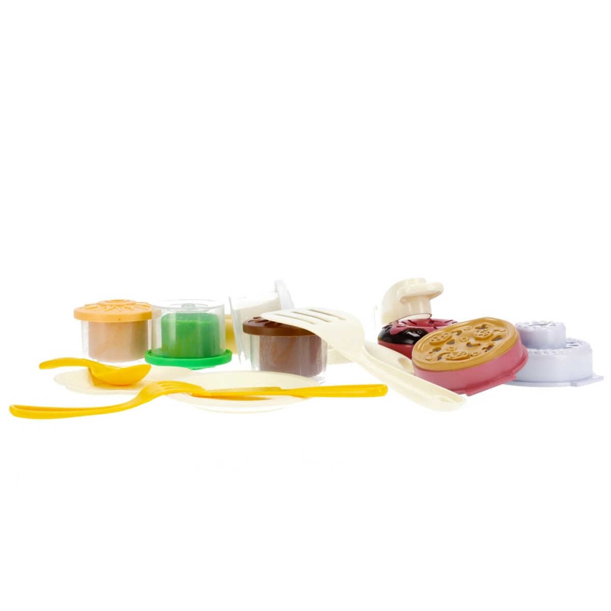 В комплект входят различные аксессуары, такие как скалка, щипцы, тарелки и формочки, которые позволяют детям готовить «вкусные блюда» и экспериментировать с формами.