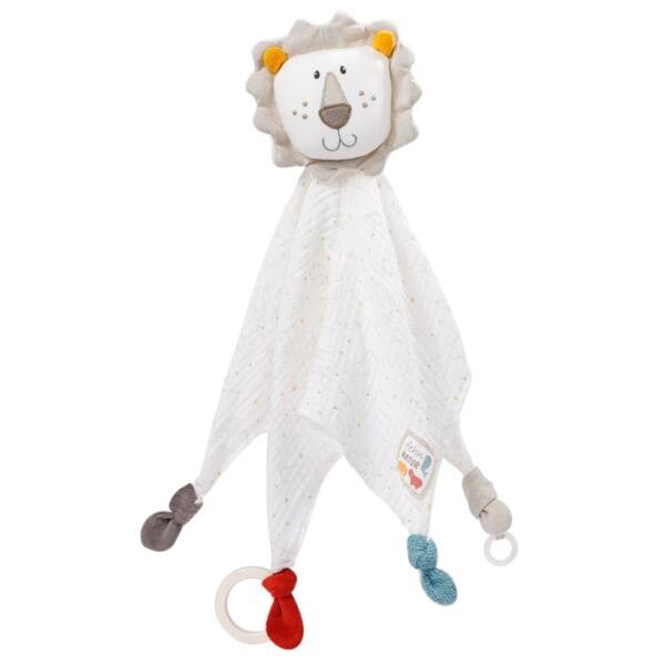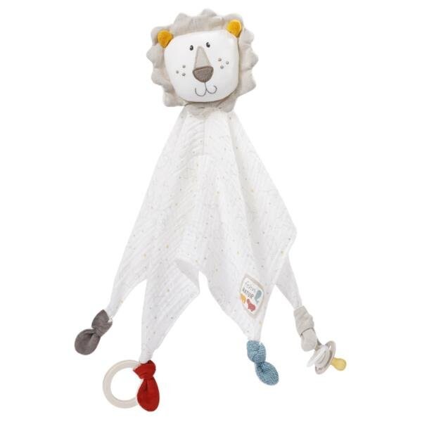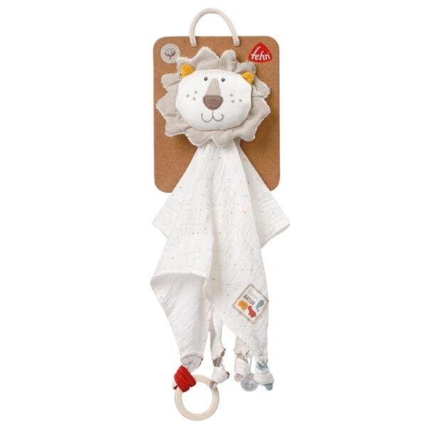 Первая мягкая игрушка Одеяло с держателем для соски Лев из коллекции: NaturaКоллекция Natura сочетает в себе превосходное качество натуральных материалов с уникальным дизайном, неизменно уделяя внимание экологии. В изделиях этой коллекции в качестве внешнего материала используется чистый сертифицированный органический хлопок. Наполнитель состоит из волокон PLA. Все материалы, используемые в игрушках, имеют натуральное происхождение. Единственный пластик, используемый в талисманах, спрятан внутри и недоступен для детей. Приятная мягкая игрушка, мягкая на ощупь, изготовлена ​​из сертифицированного органического хлопка, ее можно брать, обнимать, трогать и поглаживать. Специально пришитые кончики и деревянное кольцо стимулируют сосание, дергание и сжимание, что развивает моторику. Пушистая игрушка Лев в виде мини-пледика. он непременно покорит сердца маленьких исследователей и подарит ощущение тепла и безопасности. Благодаря силиконовому кольцу соски ее можно легко прикрепить ко всем традиционным соскам, что предотвратит потерю во время путешествия. Помещенный в коляску, переноску, манеж или колыбель, он может сопровождать ребенка днем ​​и ночью и вскоре станет лучшим другом нашего малыша. Развивает и стимулирует чувства. Улучшает моторику. Можно использовать как мини-одеяло. Имеет силиконовое кольцо для крепления соски. Внешний материал: сертифицированный органический хлопок. Наполнитель – волокна PLA. Можно стирать в 30С. Размеры изделия: 45 см. Размеры упаковки: 25 см х 20 см х 5 см. Все игрушки немецкого бренда FEHN безопасны для детей от 0+. Они изготовлены из материалов самого высокого качества. Они соответствуют стандартам EN71, CE. безопасность проверена независимыми исследовательскими институтами.
