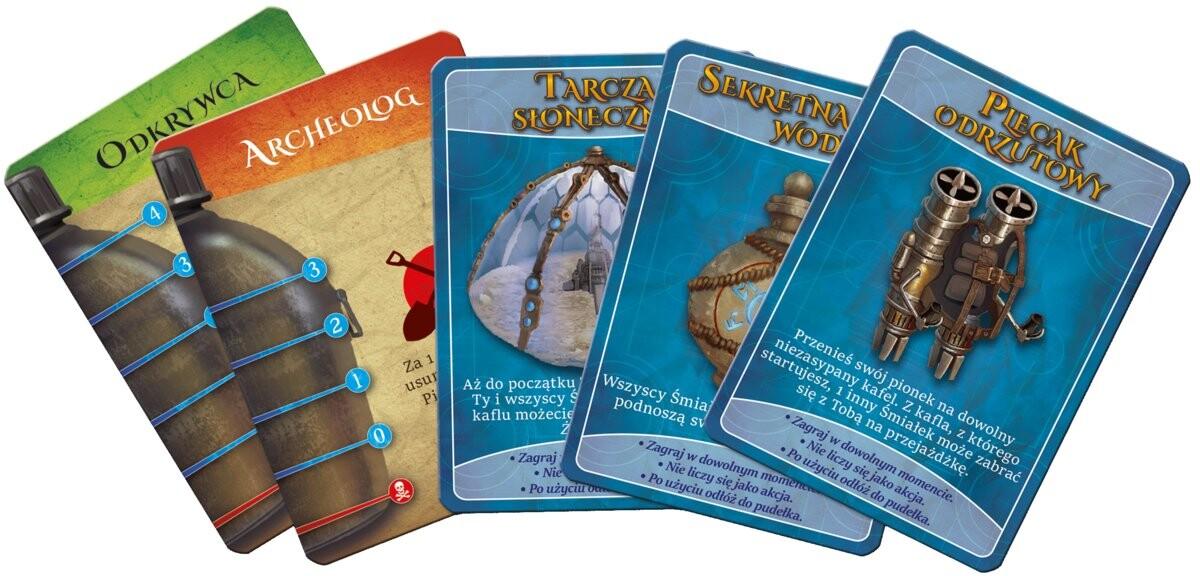 Постройте летательный аппарат, чтобы сбежать из пустыни!Как играть? В самом начале игрокам назначаются роли, определяющие особые способности и их первоначальное место на доске. Затем участники игры должны скоординировать свои действия, чтобы как можно быстрее получить набор необходимых предметов, прежде чем очередные фрагменты пустыни исчезнут из их поля зрения и навсегда останутся недоступными. Что меняется? Геймплей в Forbidden Desert немного отличается от игрового процесса в Forbidden Island, хотя основная механика перемещения по игровому полю осталась прежней. Однако в игру было добавлено несколько новых механизмов для улучшения игры, в том числе: в . модульная, часто меняющаяся плата управление ресурсами и новая система поиска артефактов — в данном случае частей летательного аппарата. Содержимое: