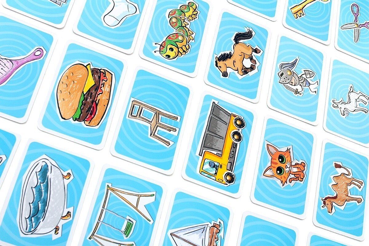 - В первом взрослый вытягивает из стопки одну карту и пытается рассказать другим игрокам, что изображено на картинке. Он не может говорить напрямую или показывать свою карточку кому-либо. Нет предела попыткам угадать дети, и когда пароль угадан, мы переходим к следующему.