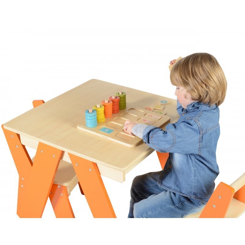 Игрушка состоит из деревянной доски с вырезанными отверстиями для блоков с цветами и их названиями и для блоков с номерами, а также 5 колышков, на которые следует размещать разноцветные круглые блоки. Игрушка способна всесторонне поддерживать развитие ребенка, помогая ему изучать цвета и цифры, улучшая его ловкость и координацию.
