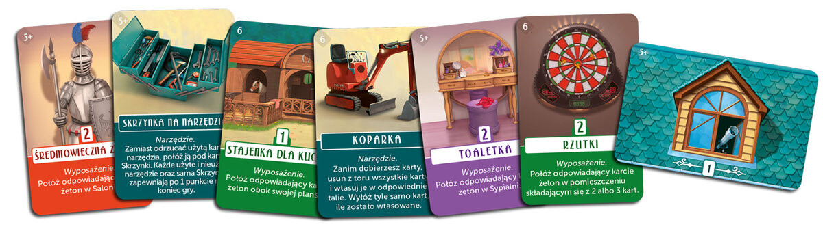 Основным преимуществом дополнения Domek: Słoneczna 156 является наличие дополнительных карт, жетонов и досок, позволяющих играть в одиночку или в 5-6 игроков.Пригласите друзей! (Дополнительные правила: Семья и друзья)