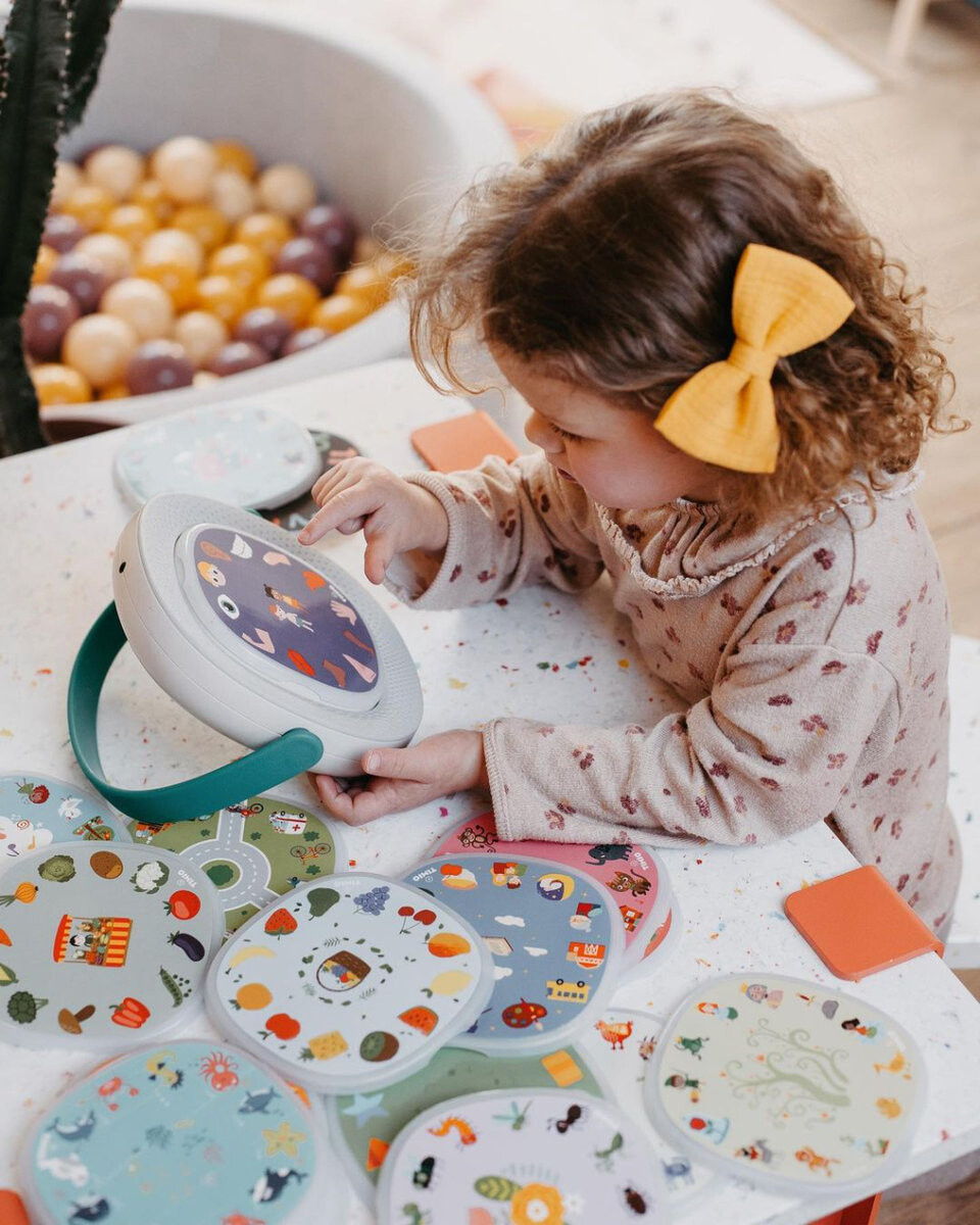 TIMIO предлагает развлечения без экрана. Соберите все 4 дополнительных набора дисков TIMIO, чтобы расширить кругозор вашего ребенка и доставить ему фантастическое удовольствие, одновременно приобретая знания на 8 языках. Плеер TIMIO может быть настроен на французский, английский, испанский языки. немецкий, китайский, голландский, итальянский и португальский. Таким образом, все входящие в комплект диски можно воспроизводить на 8 языках.