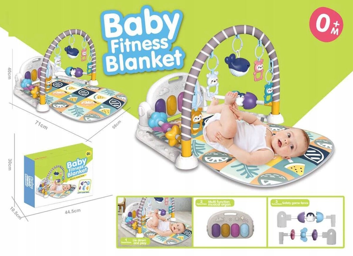 Интерактивный, многофункциональный коврик для самых маленьких с первых дней жизни. В комплект входит удобный коврик для малыша, повязка на голову с подвесками и пианино. Коврик растет вместе с ребенком. В первый период жизни, до шести месяцев, малыш может лежать на удобном коврике, пинать ножками пианино, водить руками, пытаясь дотянуться до подвесок на повязке. В возрасте от шести до двенадцати месяцев этот набор будет чрезвычайно полезен в обучении сидеть. Ребенок постарше может играть на фортепиано самостоятельно. Пианино легко трансформируется в музыкальный столик с помощью регулировочных ручек, расположенных сбоку конструкции. Мы можем наклонять пианино в нескольких положениях. или отсоедините их от комплекта и разнесите в разные места. Кроме того, пианино имеет удобную ручку для переноски. Пианино оснащено четырьмя клавишами с подсветкой и кнопкой с нотой, воспроизводящей мелодии. Также имеется переключатель включения и выключения и регулятор громкости. На повязке 4 подвески с мишками, которые тоже мягко погремывают, и дельфинчик с подсветкой. По бокам основы расположены слои бисера. Пианино питается от 3 батареек типа АА 15 В (не входят в комплект). Delfinek с 2 батарейками AAA 1,5 В (не входят в комплект). Конструкция набора и фортепиано изготовлены из биопластика – материала, полностью безопасного для детей и окружающей среды.