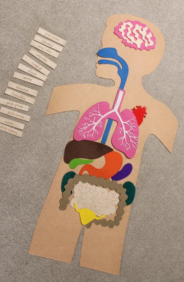 Мы рекомендуем пособие, показывающее части человеческого тела из фетра с надписями, которые также используются в Монтессори. образование.