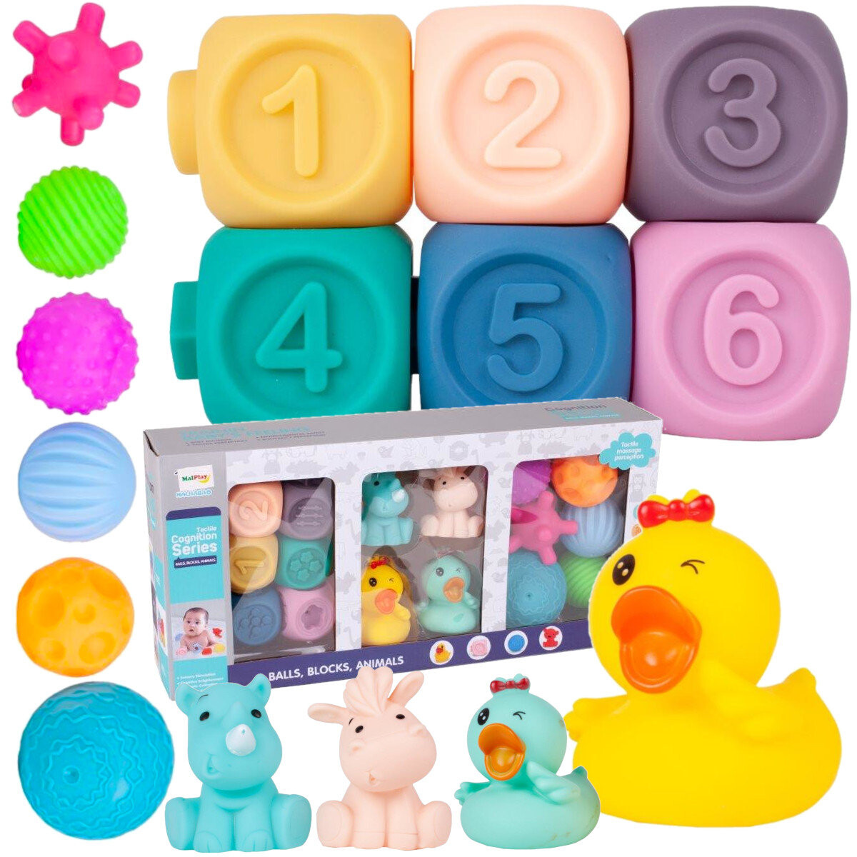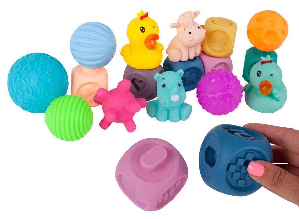 Набор состоит из целых 16 элементов, которые отличаются разнообразием форм и цветов. На них изображены цифры, узоры, нашивки, узоры и изображения самых популярных животных. Благодаря тому, что они изготовлены из легкого резинового материала, их можно использовать и в качестве прорезывателя для ребенка – они безвредны для здоровья и имеют мягкие края, поэтому ребенок может безопасно играть.