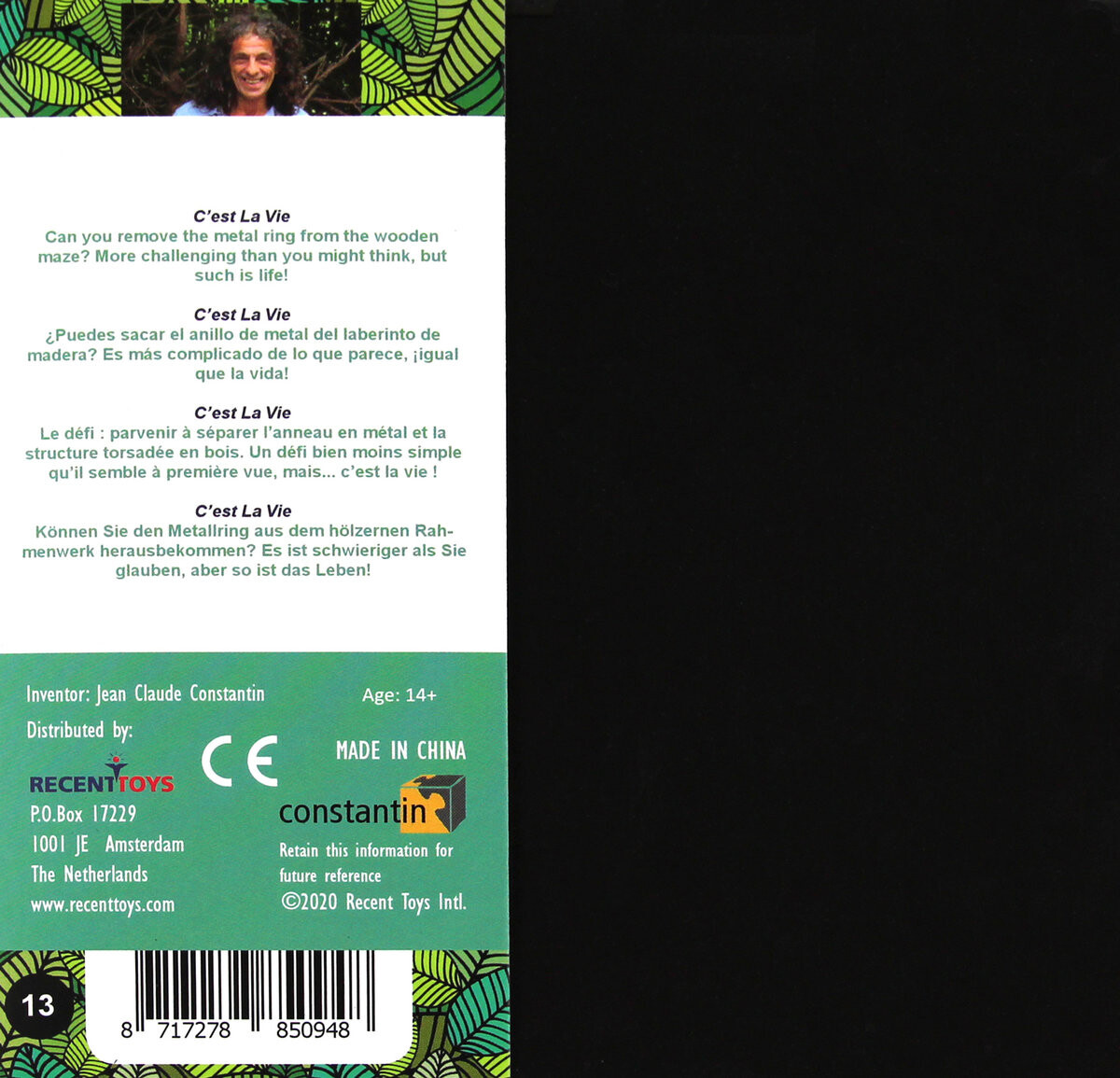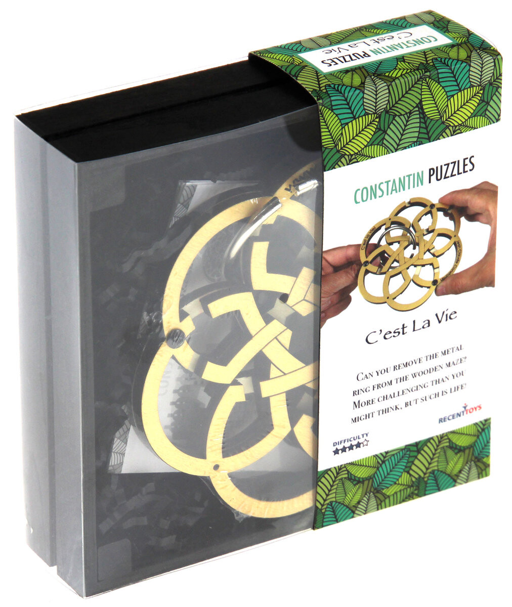 Сможете ли вы вытащить металлическое кольцо из деревянного лабиринта? Эта головоломка сложнее, чем вы думаете. Но ничего не дается легко, для достижения успеха нужно работать. Cest La Vie - Это жизнь! Жан-Клод Константин, несомненно, один из самых занятых дизайнеров головоломок за последние тридцать лет. Уникальные и разнообразные идеи, возникающие в его голове, превращаются в уникальные и визуально ошеломляющие проекты. Головоломки Жан-Клода считаются очень сложными. Для их решения вам понадобится высокая активность серого вещества, соответствующая концентрация и немного воображения. Recent Toys — производитель головоломок из Нидерландов. Как они говорят о себе: «Они создают задачки для всех, если вам нравится математика, логика, расстановка закономерностей или вы просто терпеливы и настойчивы». тогда вы обязательно найдете что-то для себя!