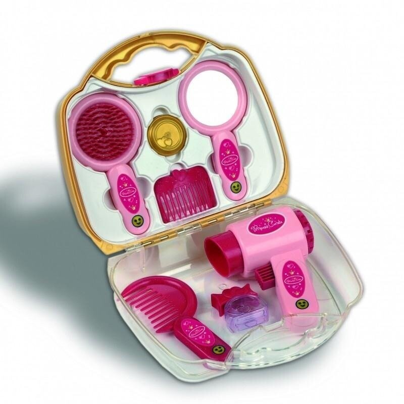 Аксессуары для ухода за волосами, помещенные в удобный золотисто-прозрачный чемодан, являются идеальным набором для игры в парикмахерскую.