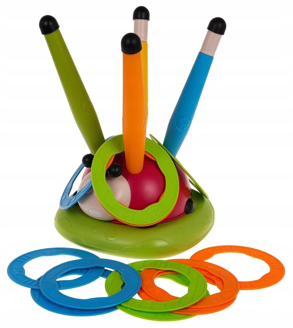 Игра предполагает бросание дисков так, чтобы они приземлялись на столбики, установленные на божьей коровке.
