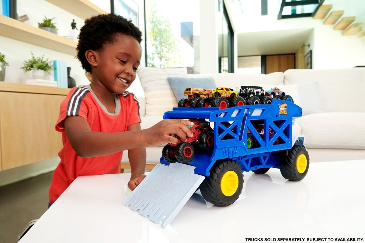 Транспортер Rhino Rig от Hot Wheels Monster Trucks вдохновлен величественным носорогом и придает игре эпическое измерение. Этот багажник в форме носорога с огромными вращающимися колесами и желтым рожком спереди может стильно перевозить Monster Trucks или автомобили Hot Wheels. Внутри можно разместить 12 монстр-траков масштаба 1:64 или 32 автомобиля Hot Wheels масштаба 1:64. Также транспортер имеет сзади опускаемую аппарель, позволяющую выбрасывать технику на дорогу (техника продается отдельно). Это идеальный подарок для детей от 3 лет и старше, которые хотят хранить и перевозить свою коллекцию Monster Trucks и Hot Wheels вместе. Цвета и декоративные элементы могут различаться.