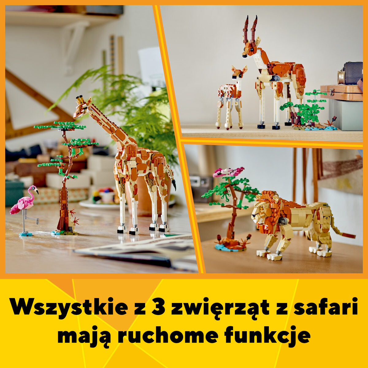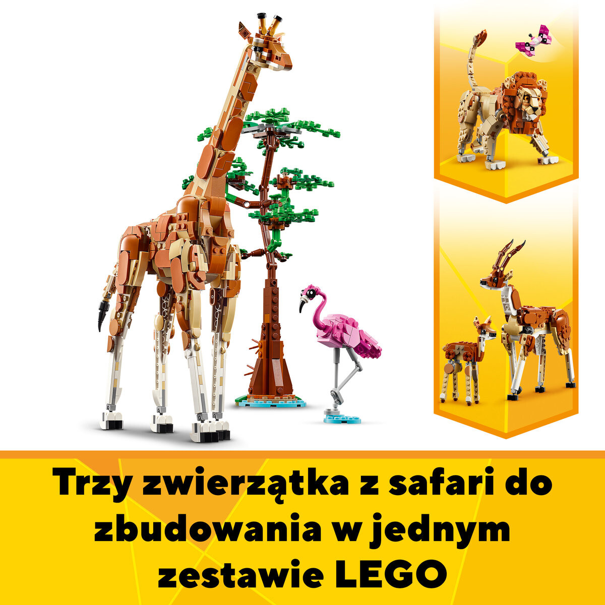 После того как мальчики и девочки в возрасте девяти лет и старше соберут этих животных, они смогут играть с ними на сафари.Дикие животные сафари LEGO CreatorПодвижный жираф