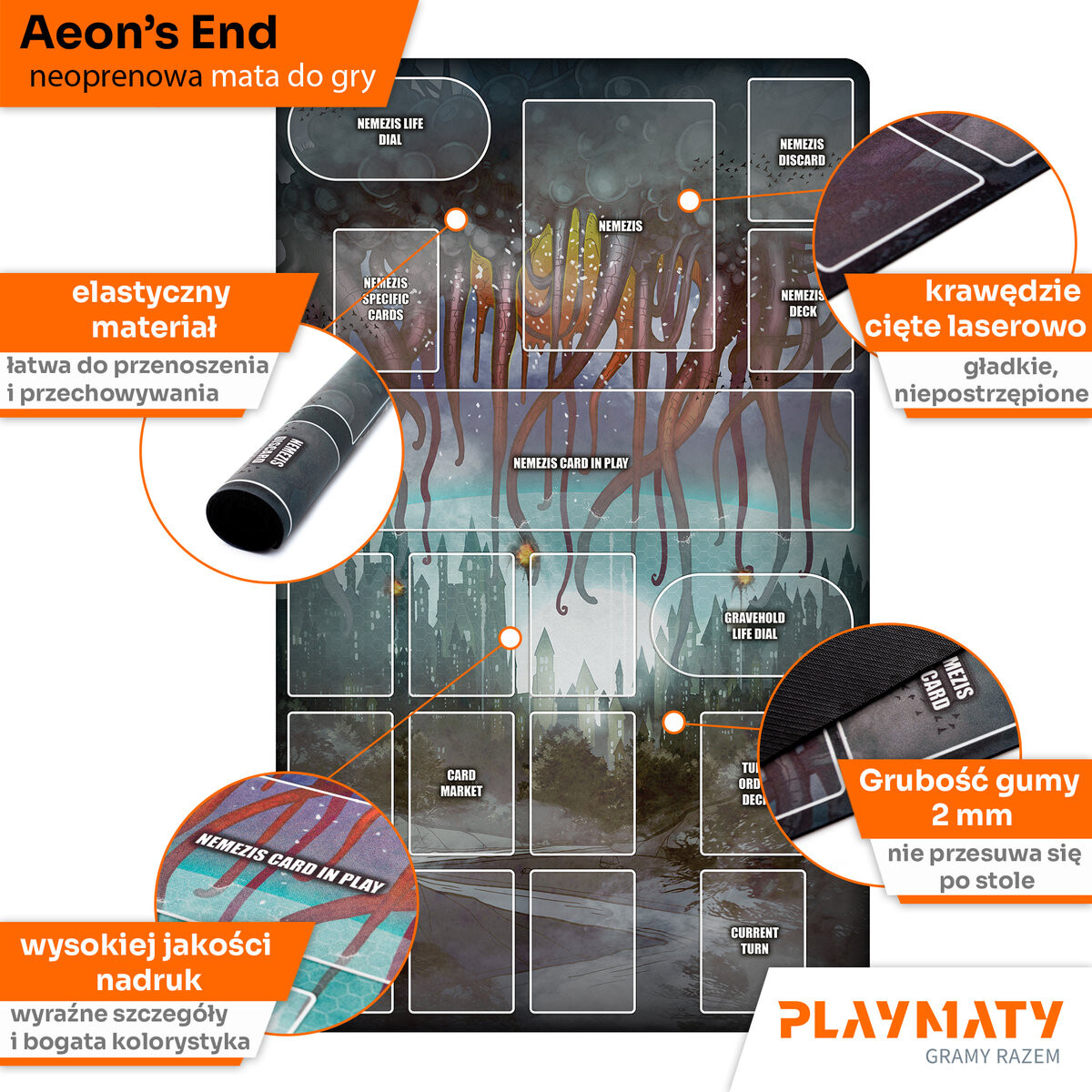 Противоскользящий резиновый коврик, посвященный игре Aeon's End. Такая визуальная настройка позволяет лучше прочувствовать игру, что значительно увеличивает впечатления от игрового процесса. Помимо повышенной эстетической ценности игры, коврик также защищает карты и аксессуары от повреждений и смещения.