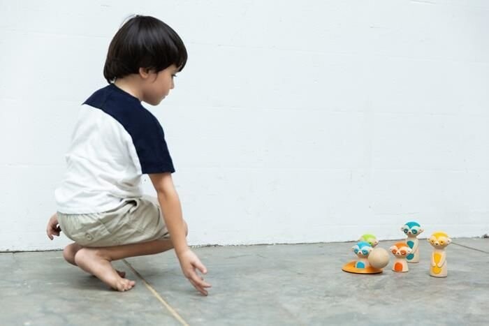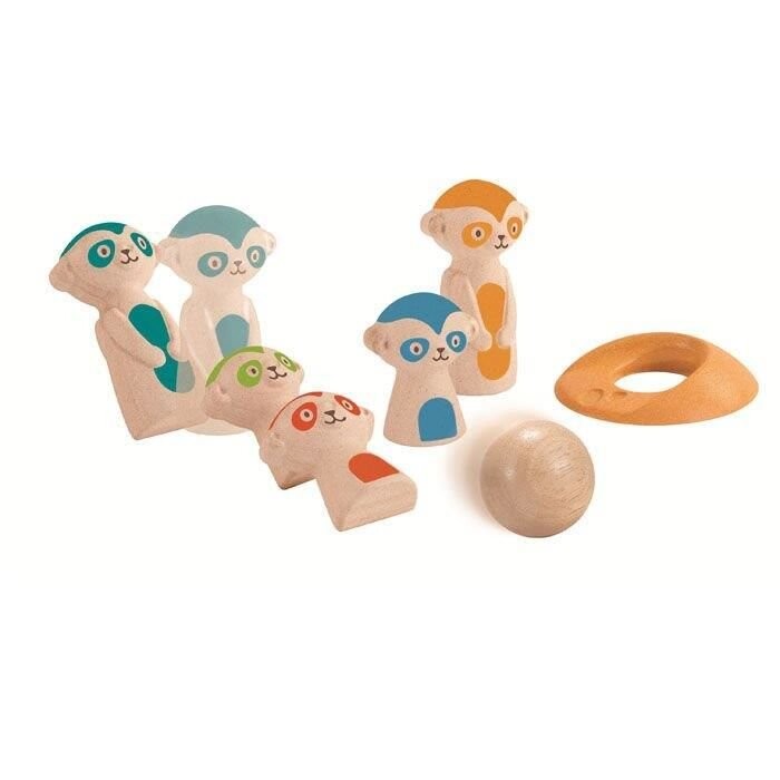 Набор кеглей для боулинга с изображением сурикатов станет приятным развлечением для детей. Эта игра идеально подходит для игры в помещении или на улице. Играя, ваши малыши будут развивать свои двигательные и физические навыки, научившись направлять мяч так, чтобы сбивать кегли, желательно «за один раз». Каждый сурикат имеет разный цвет и высоту. В нем находится один деревянный шар, 5 разноцветных кеглей для боулинга в форме суриката и один элемент - лунка, задача которой - не дать сурикату упасть, когда его поместят в нее.