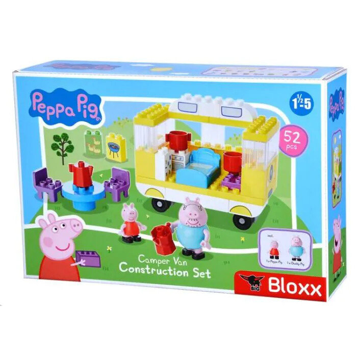 Открытие кемпера «Свинка Пеппа». Внутри: кровать, плита, холодильник и аксессуары для игры вне кемпера: гриль, стол, стулья и т. д. Набор кубиков состоит из 52 элементов, включая 2 фигурки семьи Пеппа. Блоки совместимы с другими известными блоками, доступными на рынке.