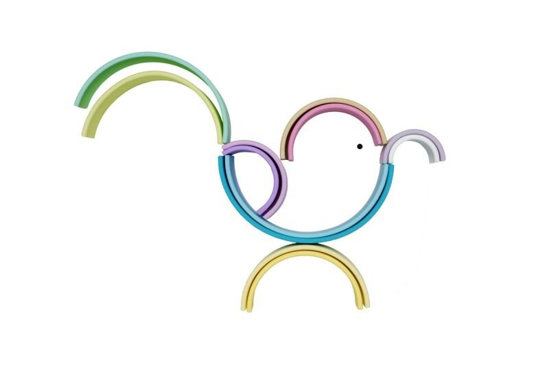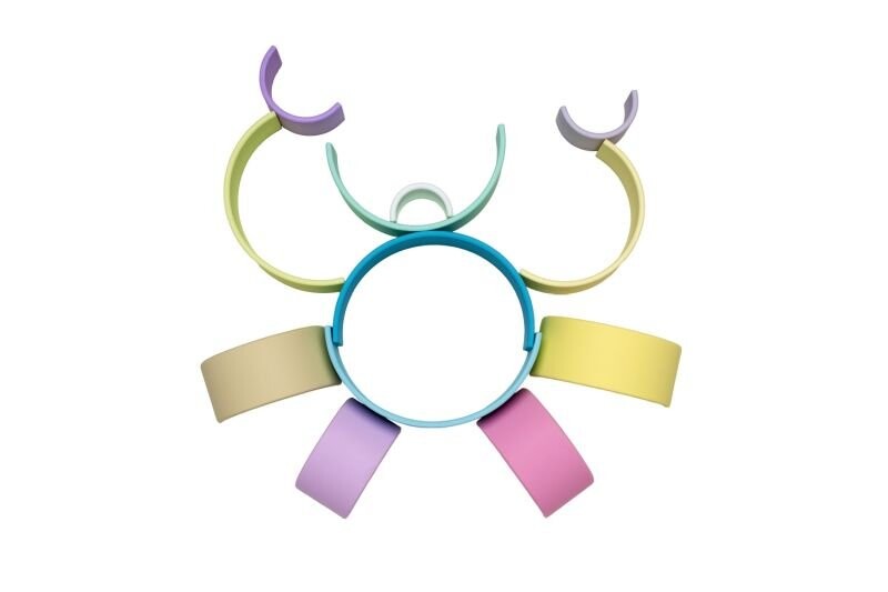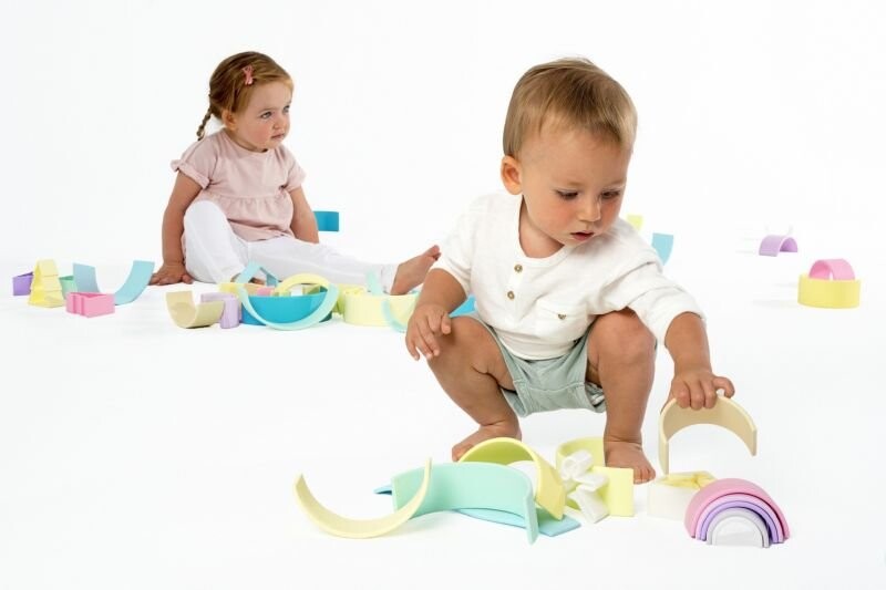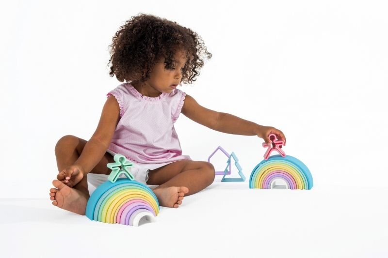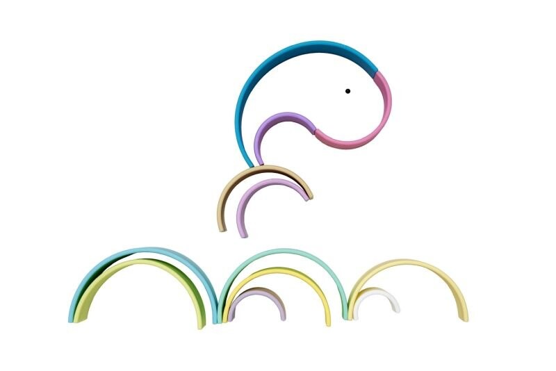 Вашему малышу наверняка понравится играть с набором радужных силиконовых игрушек Pastel из 12 предметов от dëna. Игрушки бренда dëna изготовлены из платинового силикона — мягкого и прочного материала, не содержащего BPA, что делает его на 100% безопасным для детей. Набор содержит 12 радужных дуг и отлично подойдет ребенку на любом этапе развития. 0-1 год: игрушку и прорезыватель можно объединить в новую оригинальную конструкцию. Платиновый силикон – отличный материал: мягкий, прочный и на 100% безопасный. 1-2 года: благодаря своей гибкости игрушки дэна можно безопасно кусать, бить, пинать, бросать и мочить. Все это весело и безопасно. 2-3 года: помимо безопасной игры дети учатся сортировать игрушки по форме и цвету, называть формы и строить свои первые конструкции. 3-4 года: комбинирование фигур развивает ловкость и концентрацию детей. строить все более сложные конструкции. 4–5 лет: множество возможностей для различных комбинаций, поддерживают символическое мышление и стимулируют творчество и воображение. 5–6 лет: дети могут готовить вместе со своей семьей, используя игрушки дэна, поскольку их можно использовать в качестве формочек для печенья. Эти игрушки можно мыть в посудомоечной машине. Это интересный способ развить творческие способности и научиться различать цвета и формы. С ними ваши дети смогут собрать все возможные конструкции!