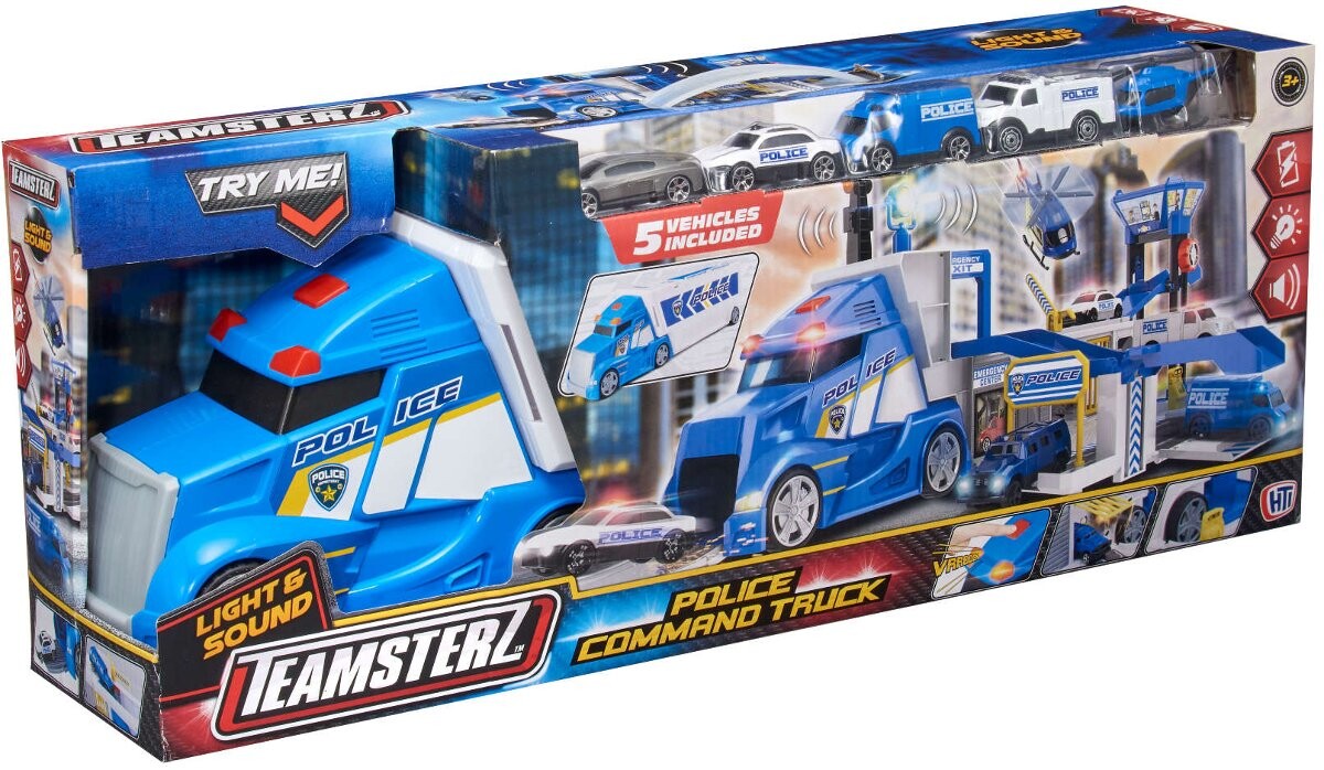 HTI 1417332 Teamsterz Police Command Truck свет/звук Полицейский транспортер с полицейскими машинами. Требуемые батарейки: 2 тестовых батарейки типа ААА в комплекте. Продукт подходит для детей старше 3 лет.
