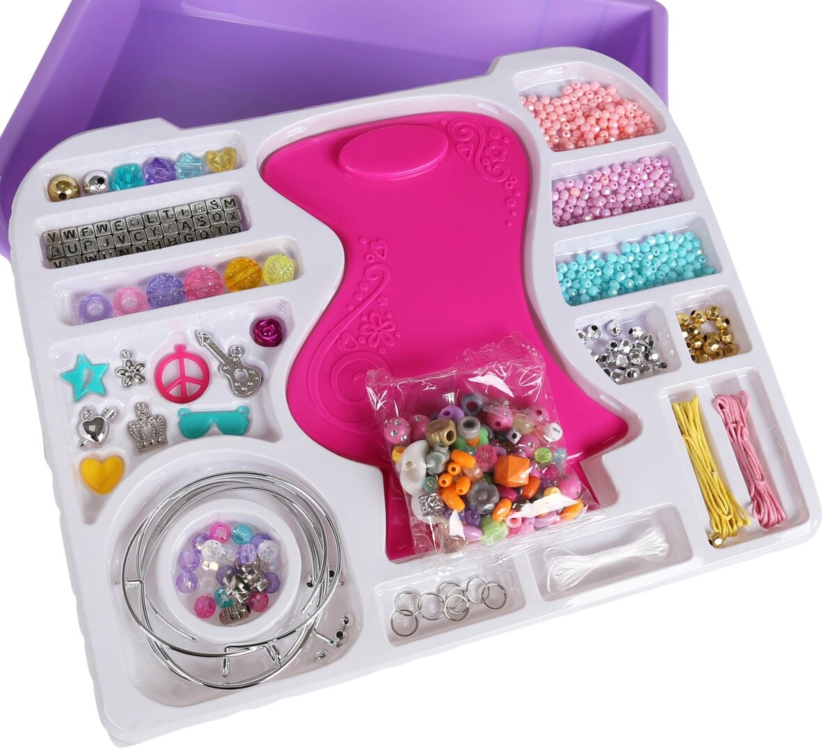 Содержимое набора: 9 видов нанизывания бус разного цвета, размера, формы и фактуры, 3 нити. бусины, машинка для изготовления браслетов, микс подвесок, ободок - основа для нанизывания брелоков.