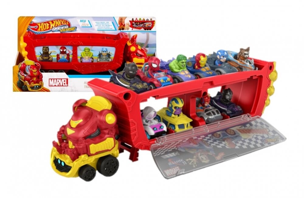 Загрузите транспортер Hot Wheels RacerVerse Marvel Hulkbuster с гонщиками Hot Wheels и отправляйтесь в путь. Этот транспортер в стиле Железного человека украшен графикой Stark Racing и вмещает 10 автомобилей Hot Wheels RacerVerse или Hot Wheels в масштабе 1:64. транспортные средства. Отсоедините кабину и поднимите шлем, чтобы увидеть несъемную фигуру Тони Старка на водительском сиденье, дополняющую истории, которые вы воображаете. Цвета и декоративные элементы могут различаться. Дополнительные автомобили Hot Wheels RacerVerse продаются отдельно.