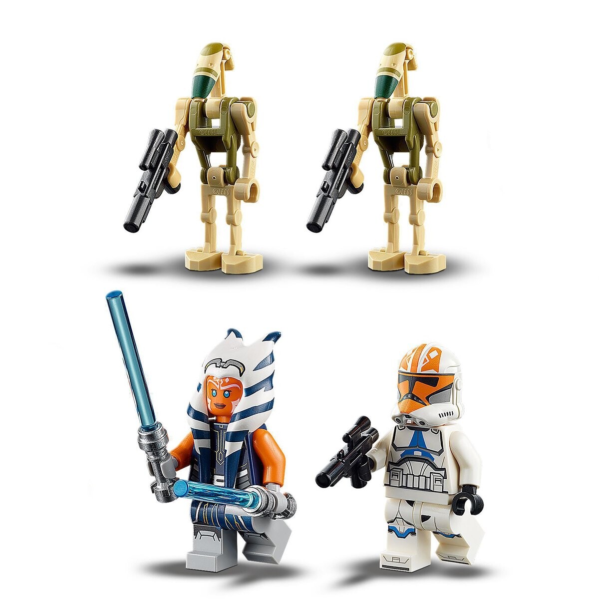 - В комплект входят две минифигурки LEGO Star Wars — Асока Тано и ее солдат-клон, а также фигурки LEGO-водителя танка AAT и боевого дроида. Есть также оружие, в том числе два световых меча, чтобы дети могли разыгрывать батальные сцены.