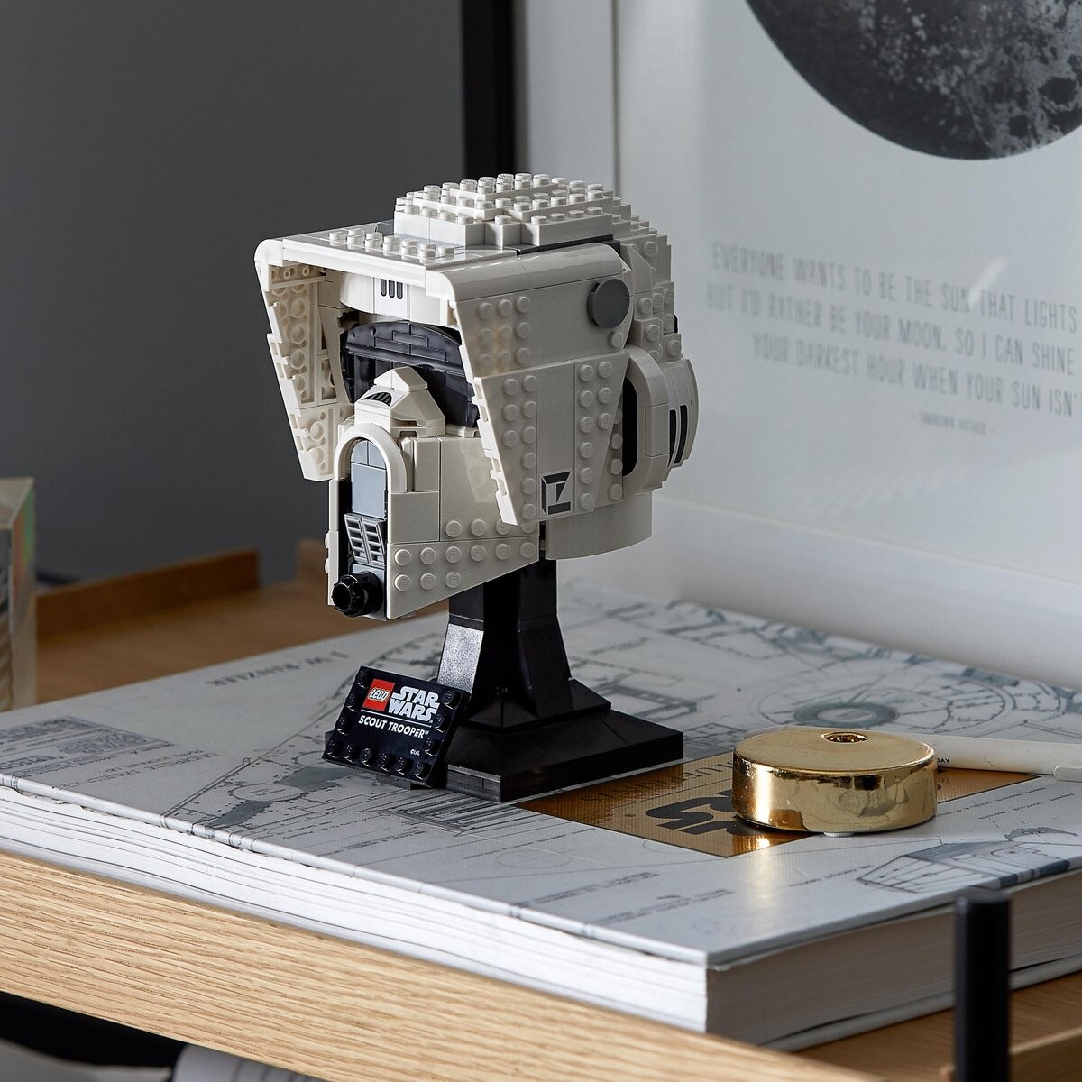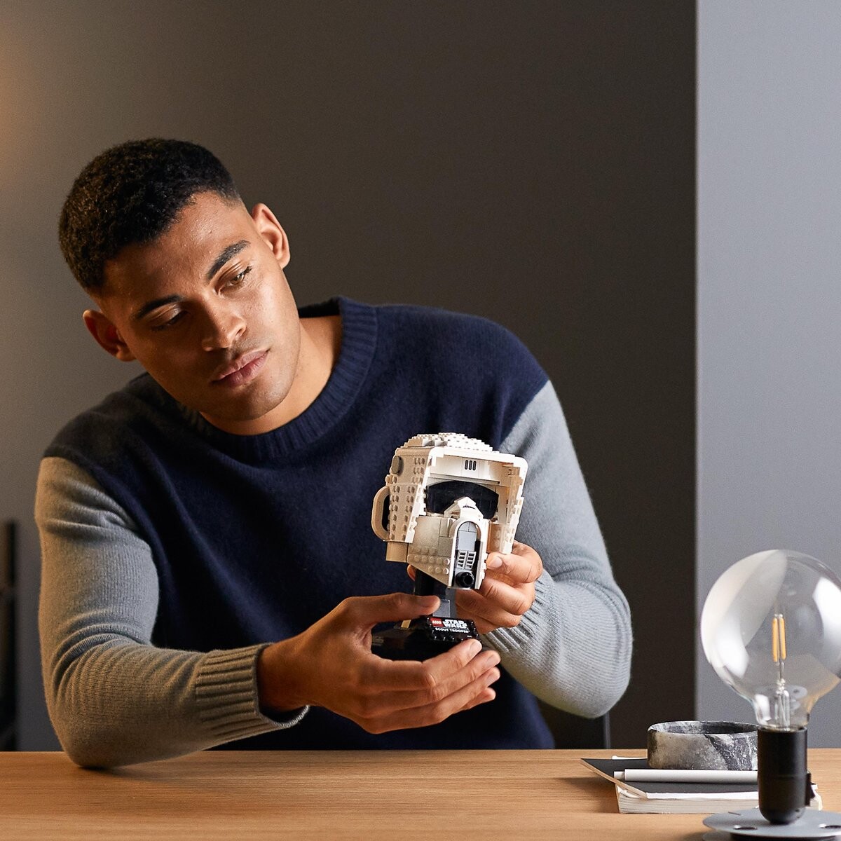 Соберите детализированный шлем штурмовика-разведчика с помощью серии коллекционных моделей зданий LEGO Star Wars для взрослых. Захватывающие сцены