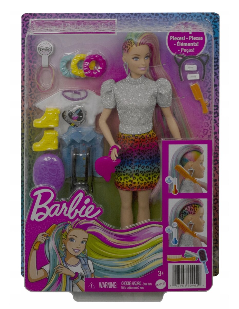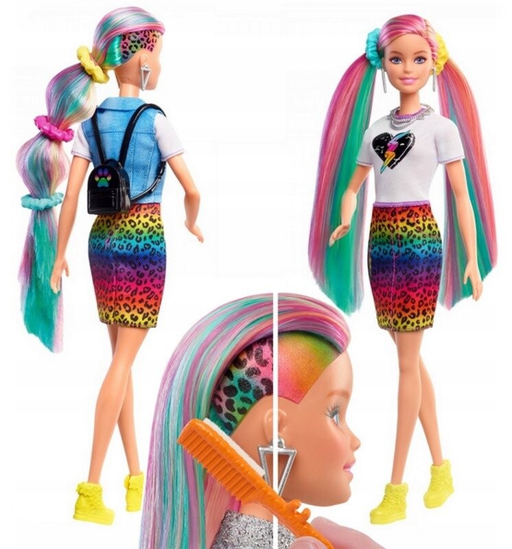 Откройте для себя красочные развлечения, связанные с модой и укладкой волос. Барби любит исследовать разные цвета и стили в поисках идеального образа! Вы можете сойти с ума от куклы Barbie Hairstyle Colorful Leopard — у нее длинные радужные волосы, функция изменения цвета и 14 аксессуаров для волос и укладок.