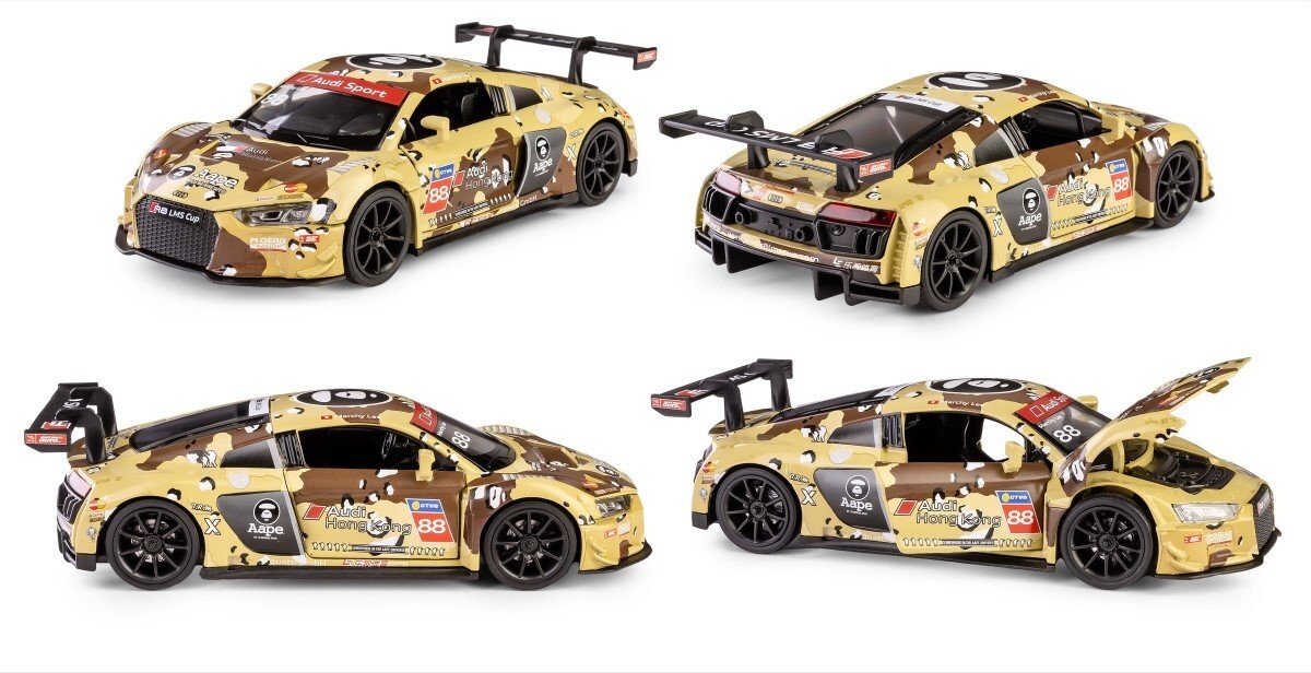 Audi R8 LMS GT3 Audi R8 LMS Cup 2016 /AAPE #88, модель в масштабе 1:32. Автомобиль со световыми элементами, характерным звуком раллийного автомобиля и тяговым приводом достоверно воспроизводит свойства раллийных автомобилей, а дополнительно открывающиеся двери и крышка двигателя позволяют рассмотреть детали салона автомобиля. В коллекции моделей RMZ HOBBY представлены раллийные автомобили, участвующие в трековых гонках различных федераций со всего мира. В коллекцию вошли автомобили с логотипами известных модных брендов, таких как AAPE, BATHING APE и EVISU, которые спонсируют раллийные команды.