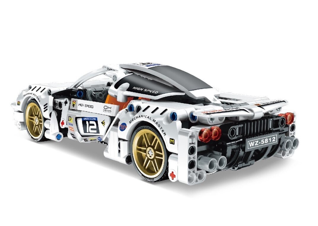 В блоках изображен супергоночный автомобиль белого цвета, оснащенный функция тянуть и назад.