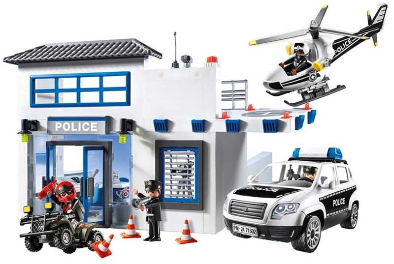 Состав набора: 4 х фигурка - трое полицейских и преступник (ок. 7,5 см) 1 х полицейский участок (ок. 38 х 20 х 24 см) 1 полицейская машина (ок. 23 х 12 х 11 см) 1 полицейский вертолет 1 квадроцикл 1 командный пункт 1 стол с двумя стульями 1 камера со штативом 9 х полицейский гаджет 3 дорожных столба