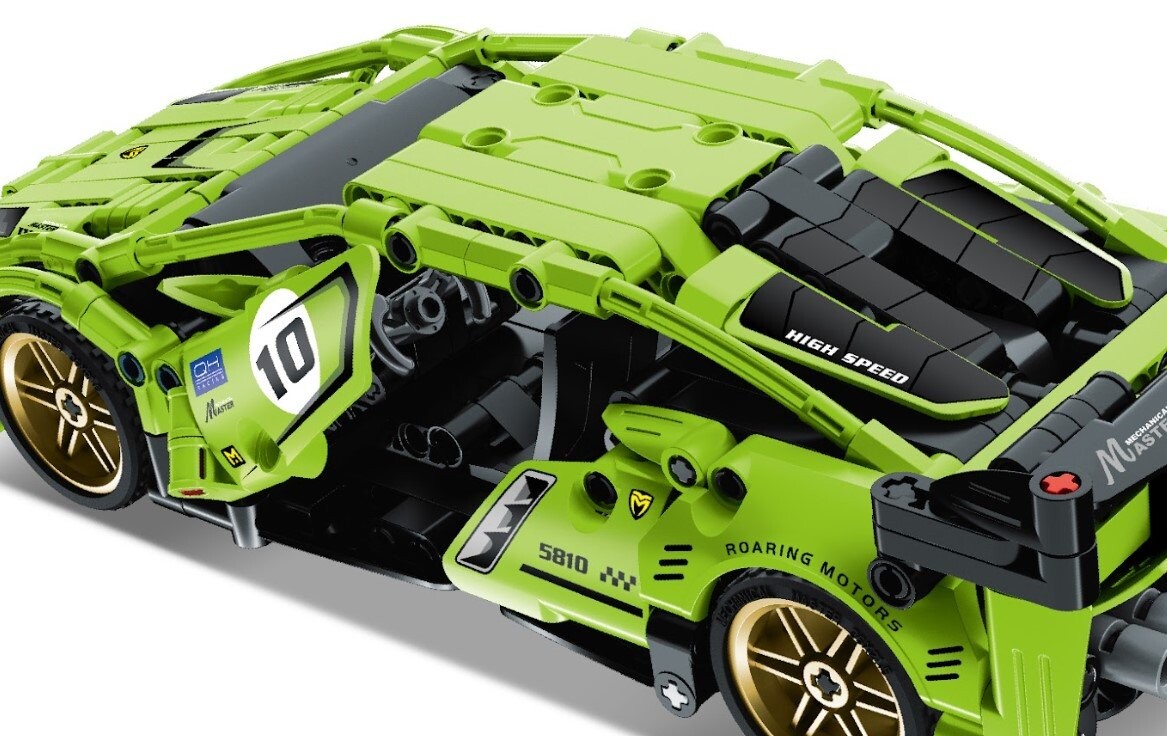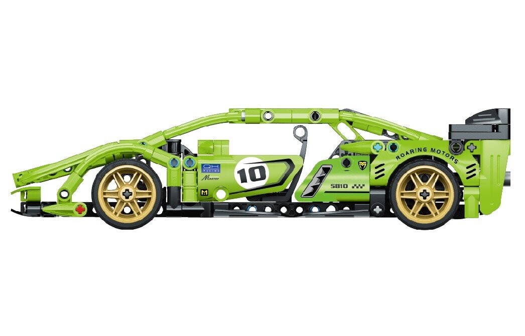 В блоках изображен гоночный автомобиль с функцией тяги и назад. Набор состоит из 457 элементов.