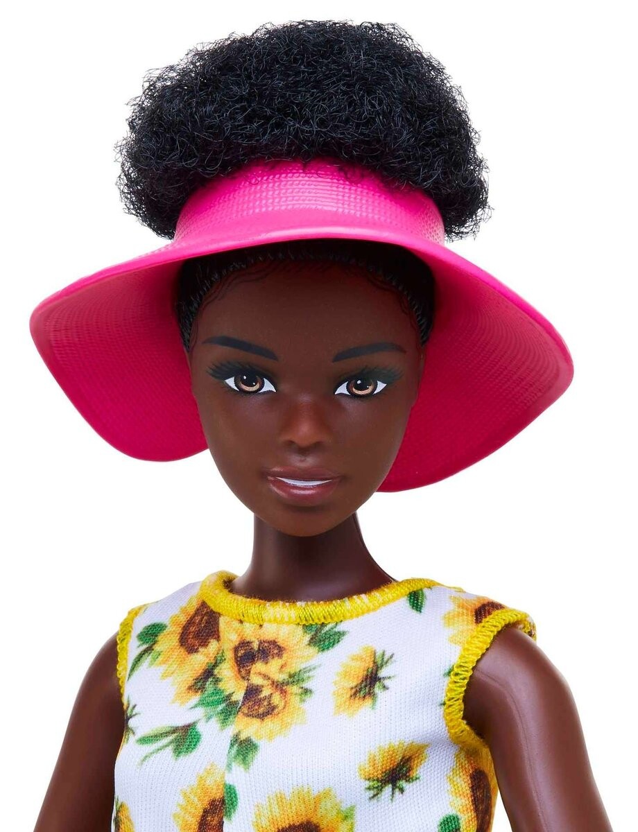 У куклы черные волосы, причудливая афро-прическа и карие глаза. Она одета в белый комбинезон с принтом подсолнухов и зеленые сапоги-велингтоны.