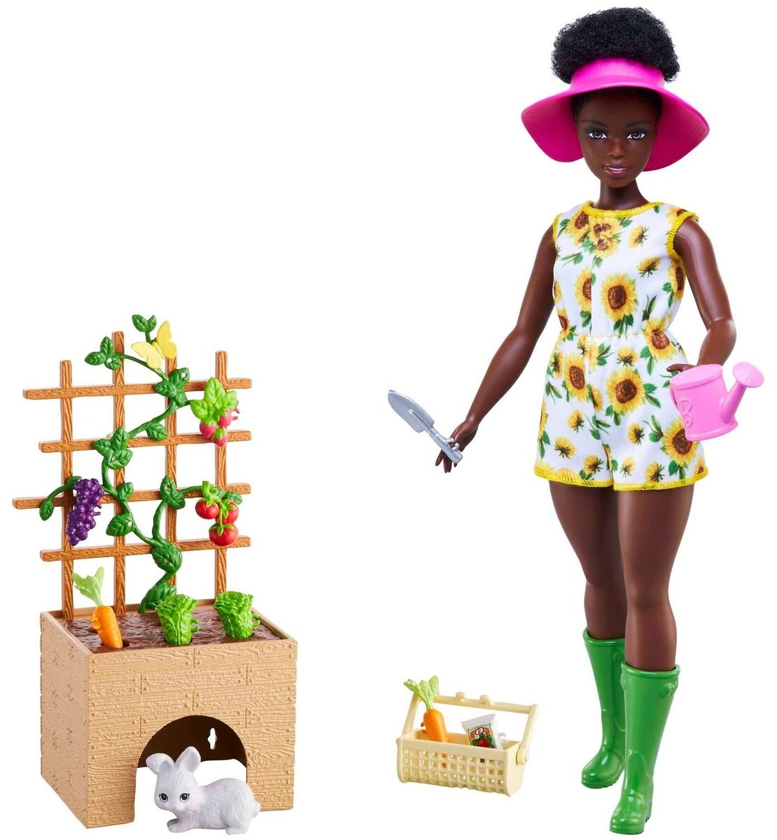 Она заботится о кролике и маленьком садике. В комплекте с куклой идет корзинка для фруктов и овощей, маленькая розовая лейка, пакетик с семенами, шляпа от солнца и небольшая садовая лопатка. а также фрукты и овощи. В небольшом саду есть ямки для посадки овощей, а также есть укрытие для кролика.