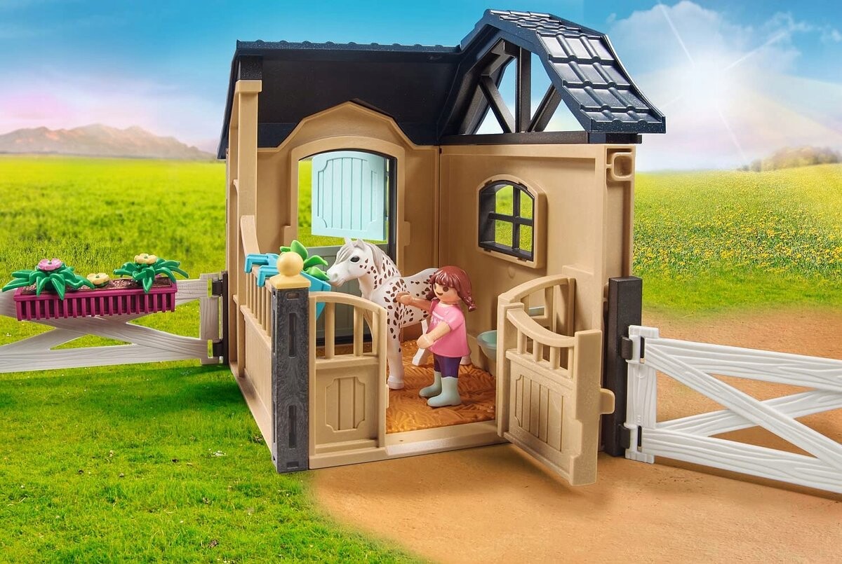 Вам нужно больше места для лошадей? Тогда это расширение конюшни PLAYMOBIL именно для вас. В конюшне за пони можно ухаживать и кормить, а в загон он выходит через дверь конюшни. Спокойная прогулка на свежем воздухе – это, конечно, самое прекрасное для людей и животных. На прилагаемых пустых этикетках можно написать имя вашей любимой лошади и приклеить их на дверь конюшни.