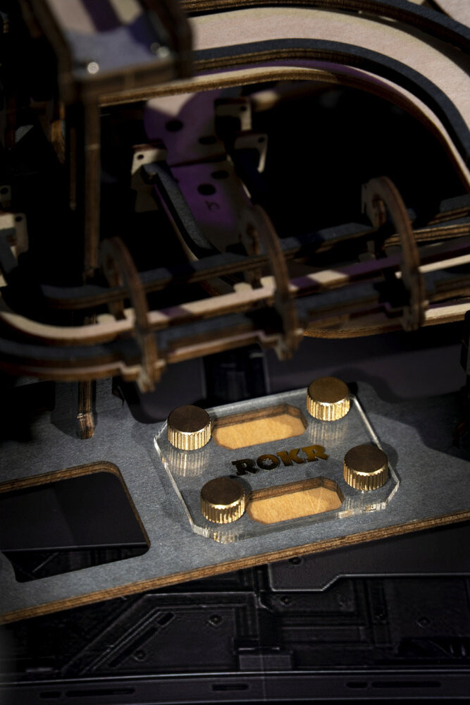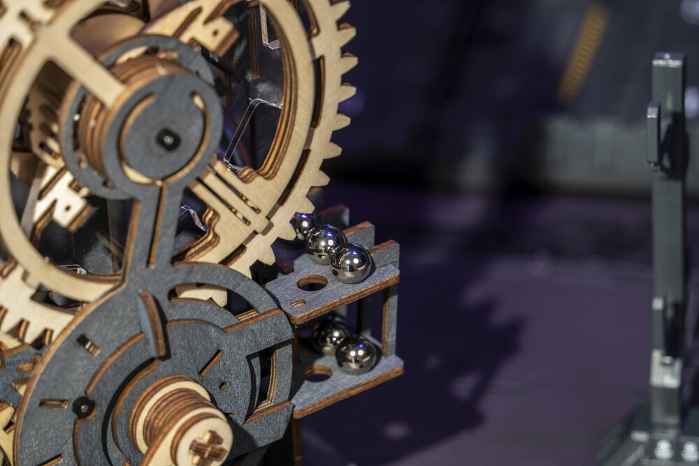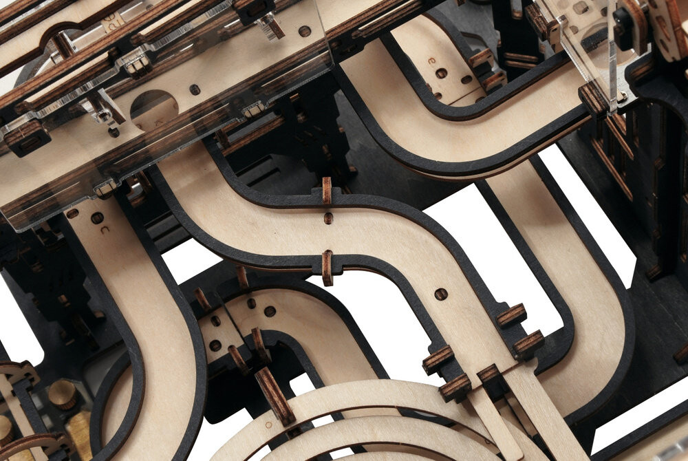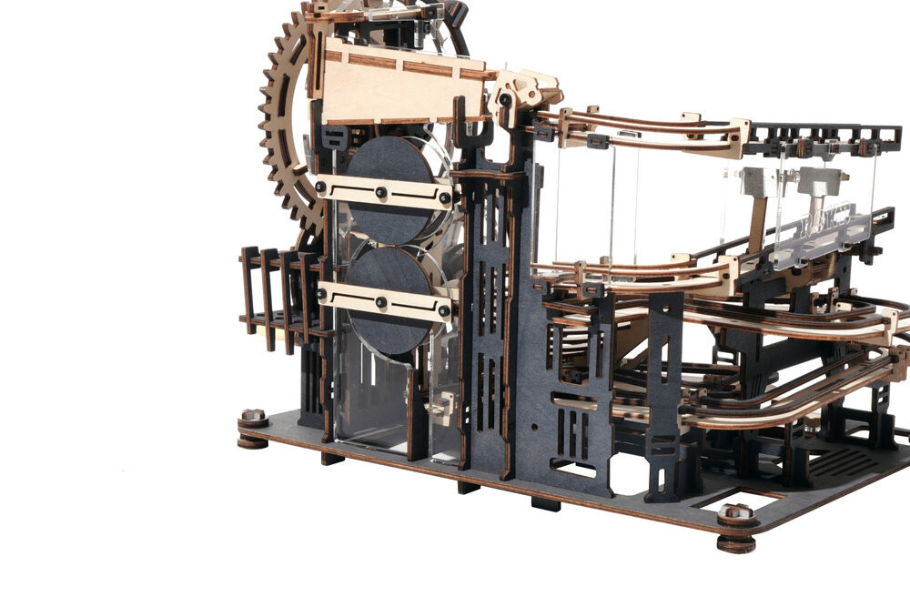 Набор для сборки деревянной дорожки, на которой металлические шарики преодолевают различные препятствия. Модель приводится в движение вручную путем поворота кривошипно-шатунного механизма. Набор изготовлен из качественной фанеры и представляет собой листы с заранее вырезанными и пронумерованными элементами, которые перед сборкой необходимо отделить от выреза, а затем соединить без использования клея, согласно прилагаемой инструкции. В упаковке 10 металлических шариков.