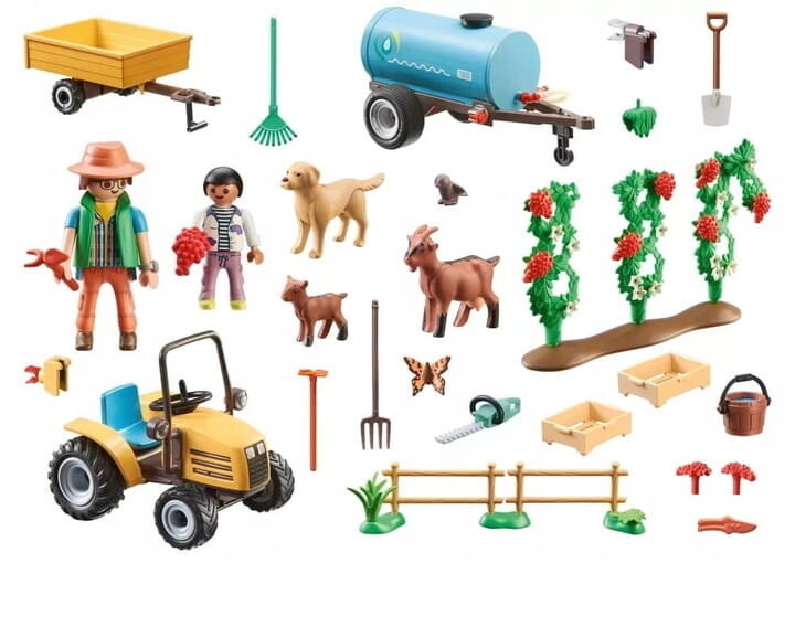 В комплект входят:Фигурки: 1 мужчина, 1 мальчик; Животные: 1 лабрадор, 1 бабочка, 2 козла, 1 птица; Аксессуары: 1 небольшой трактор, 1 прицеп, 1 бочка для воды, 1 ножницы для роз, 2 ящика для овощей, 1 секатор, 1 вилка, 1 метла для листьев, 1 лопата, 2 мотыги, 1 деревянное ведро, 10 упаковок для фруктов, 6 вьющихся растений. 13 цветов, 1 элемент травы Фермер выходит в поле поливать его. В пути его сопровождает помощник. Резервуар для воды можно наполнить водой и при необходимости заменить прицепом. чтобы доставить урожай домой в целости и сохранности.