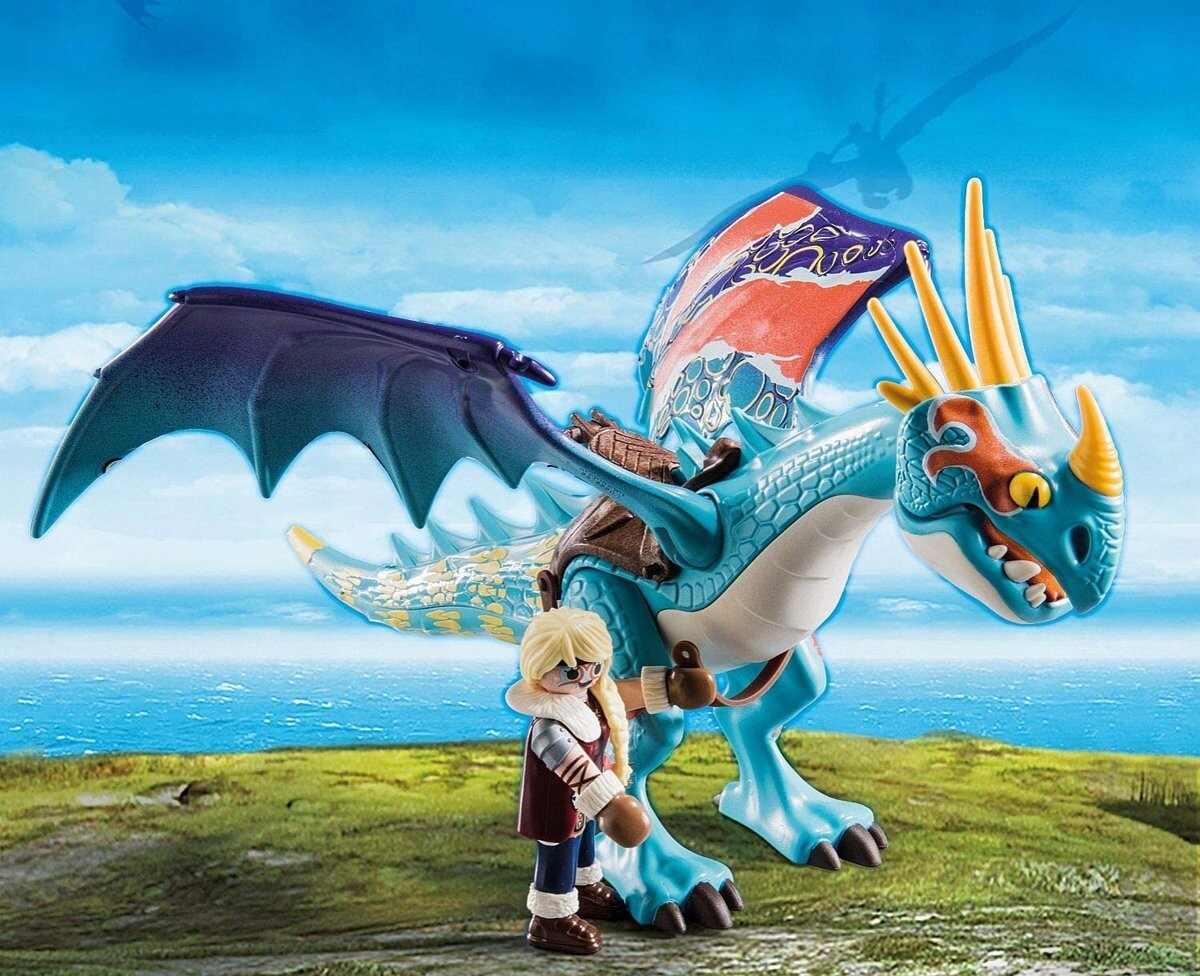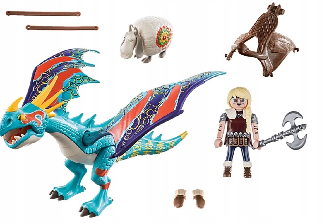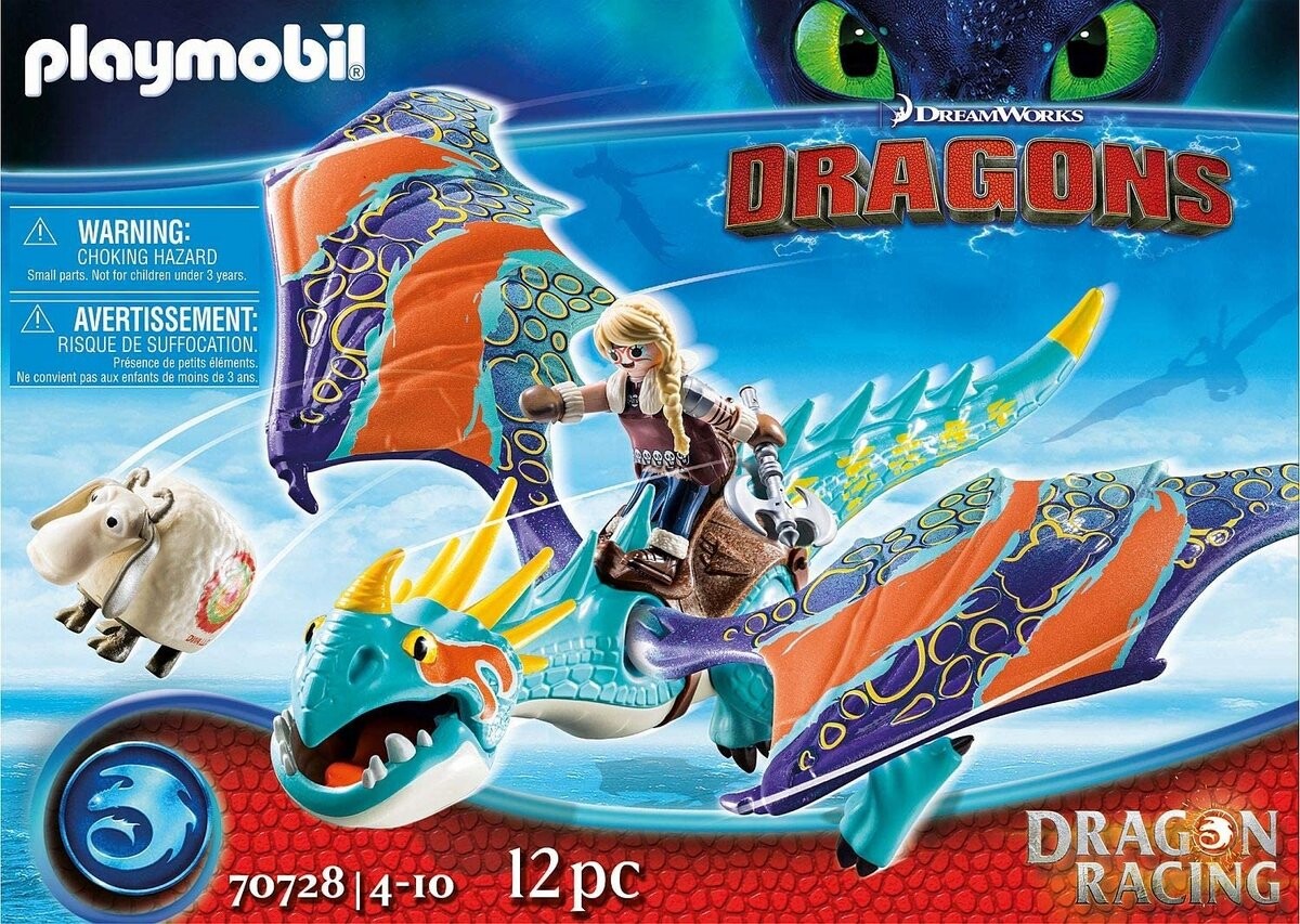 Dragon Racing: Astrid and Wichura 70728 со съемным седлом. Овцу можно катапультировать (требуется артикул 9461, продается отдельно). Дети могут играть с этим набором самостоятельно или комбинировать его с другими наборами Playmobil, что дает им возможность создавать новые нити во время игры. Воссоздайте любимые сцены из фильма или создайте свои собственные!