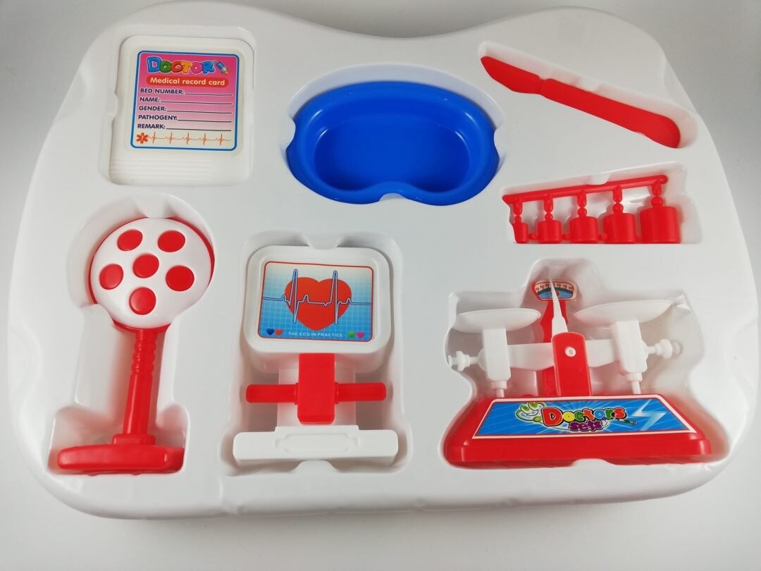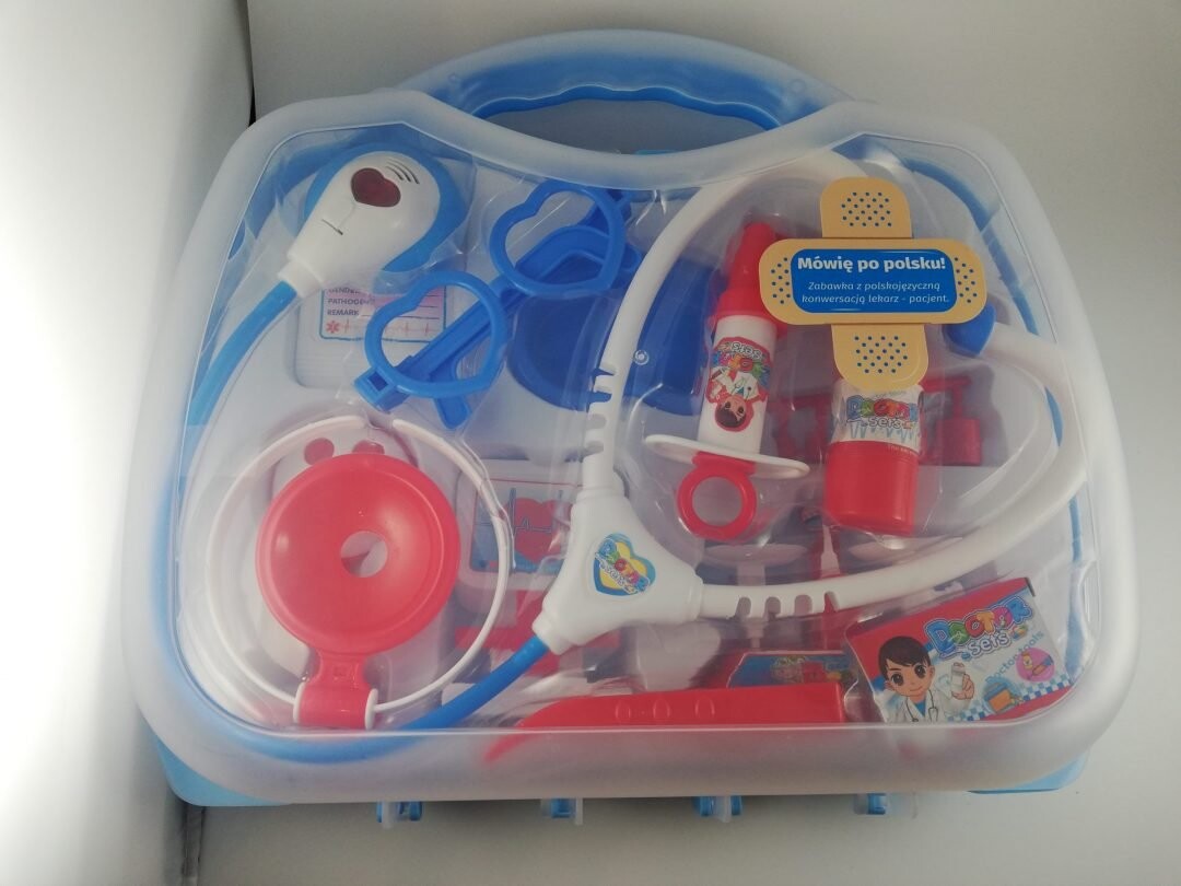 Игрушка предназначена для детей старше 3 лет. В комплект входят, среди прочего, шприц, термометр, ножницы, очки и другие элементы. Стетоскоп загорается, издает звуки сердцебиения, и врач разговаривает с пациентом на польском языке. В комплект не входят батарейки. (G2465)