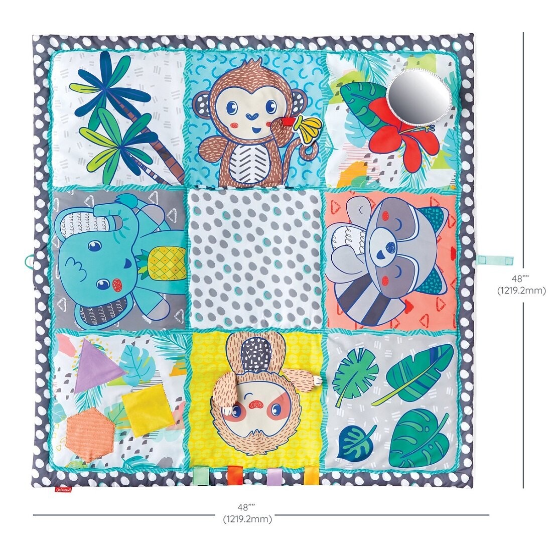 Этот исключительно большой коврик для упражнений создает безопасное и мягкое место для игр ребенка. Текстурированные ткани и шуршащие элементы обеспечивают раннюю сенсорную интеграцию, а контрастные цвета привлекают внимание ребенка и побуждают к игре.